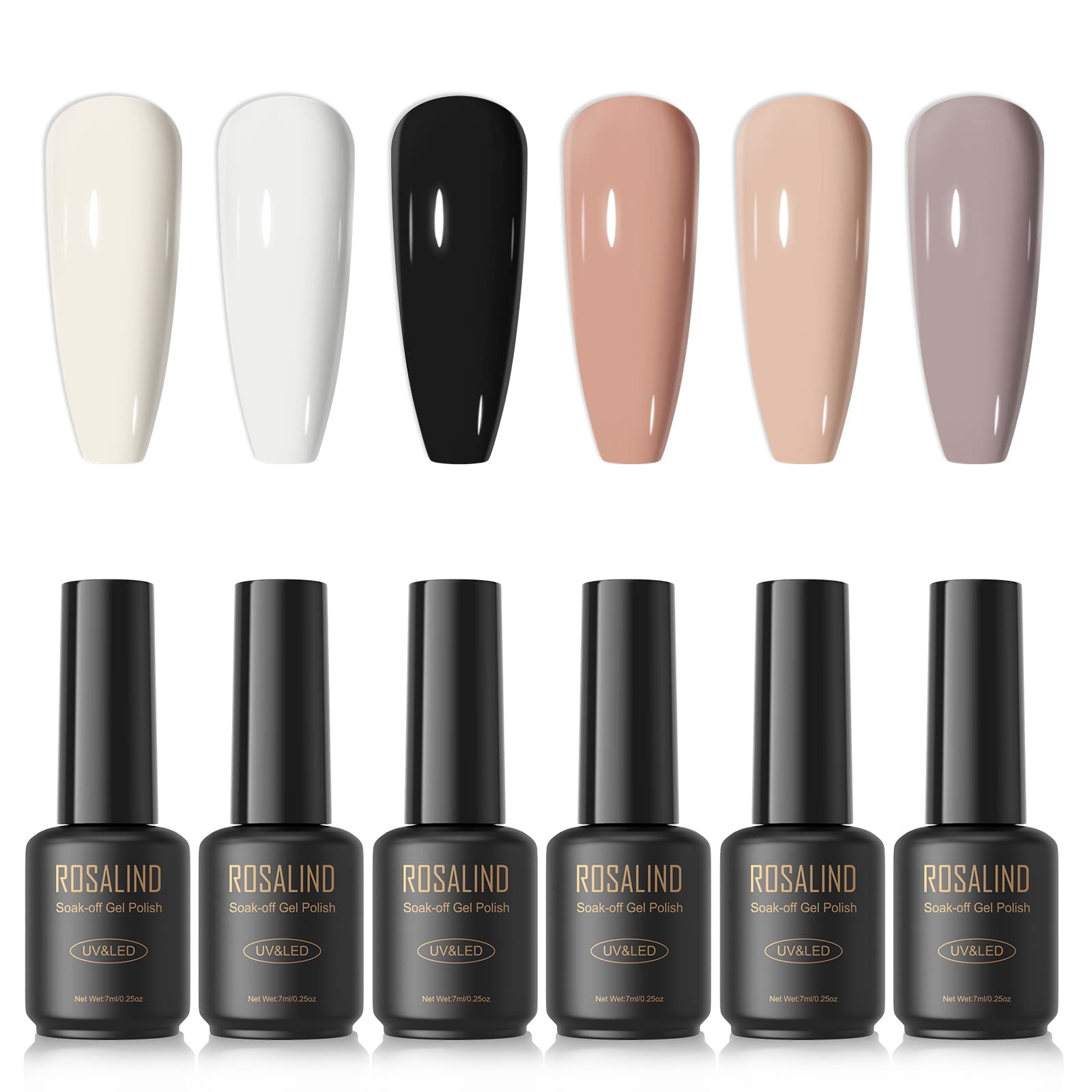 ROSALIND 6PCS White Black Gel Nail Polish Set Fall Nude Gel Polishes, Neutral Gel Nail Polish Black White Colors Soak off Nude Brown Gel Polish Fall Colors Skin Tones Nail Art All Season Gel Manicure Bleck Nude