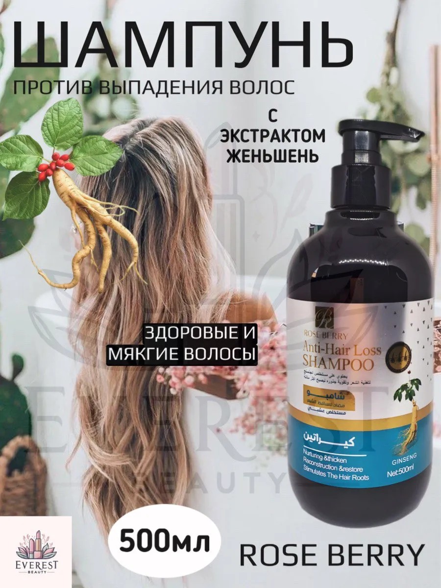 Шампунь для волос с женьшенем от Rose Berry – это комплексный подход для поддержания красоты и здоровья ваших волос. Натуральный состав комплекса сделает уход за волосами простым и приятным. Женьшень своим антисептическим и антивоспалительным свойствам помогает предотвратить выпадение волос и бороться с перхотью, удерживать влагу в волосах, что придает им естественный блеск и здоровый вид. Экстракт женьшеня — способствует улучшению кровообращения в коже головы и укрепляя их корни. Женьшень также помогает бороться с перхотью и излишней жирностью.Он обеспечивает мягкое очищение без пересушивания, придавая свежесть и объем. Женский шампунь от выпадения волос из натуральных компонентов обеспечивает глубокое увлажнение кожи головы, придает волосам гладкость и блеск.Используйте лечебное косметическое средство для ежедневного ухода, чтобы наслаждаться сильными и блестящими волосами каждый день. Результат от применения - это здоровая кожа головы и крепкие, густые и блестящие волосы без перхоти и секущихся ломких кончиков. Шампунь от облысения подходят для сухих, жирных у корней, поврежденных и нормальных волос. Легко смывается, обеспечивая непревзойденный прикорневой объем и чистоту без утяжеления.Благодаря высокому содержанию полезных и натуральных веществ, средство восстанавливает волосы, делая их гладкими, упругими и блестящими. Этот шампунь для роста волос не содержит токсичных сульфатов, парабенов и силиконов, обеспечивая безопасное и эффективное очищение. Его питательная формула укрепляет тонкие волосы, способствуя их росту и улучшению текстуры. Уходовая косметика является универсальным и подходит и для женщин, и для мужчин.Профессиональный шампунь будет идеальным дополнением в набор косметики для ухода за волосами или в подарочный набор косметики для женщин на любой праздник. Подарите своим волосам идеальный уход с шампунем Anti-Hair Loss Shampoo.Этот шампунь обеспечит вашим волосам все необходимое для здоровья и красоты, делая их мягкими, блестящими и полными жизни.