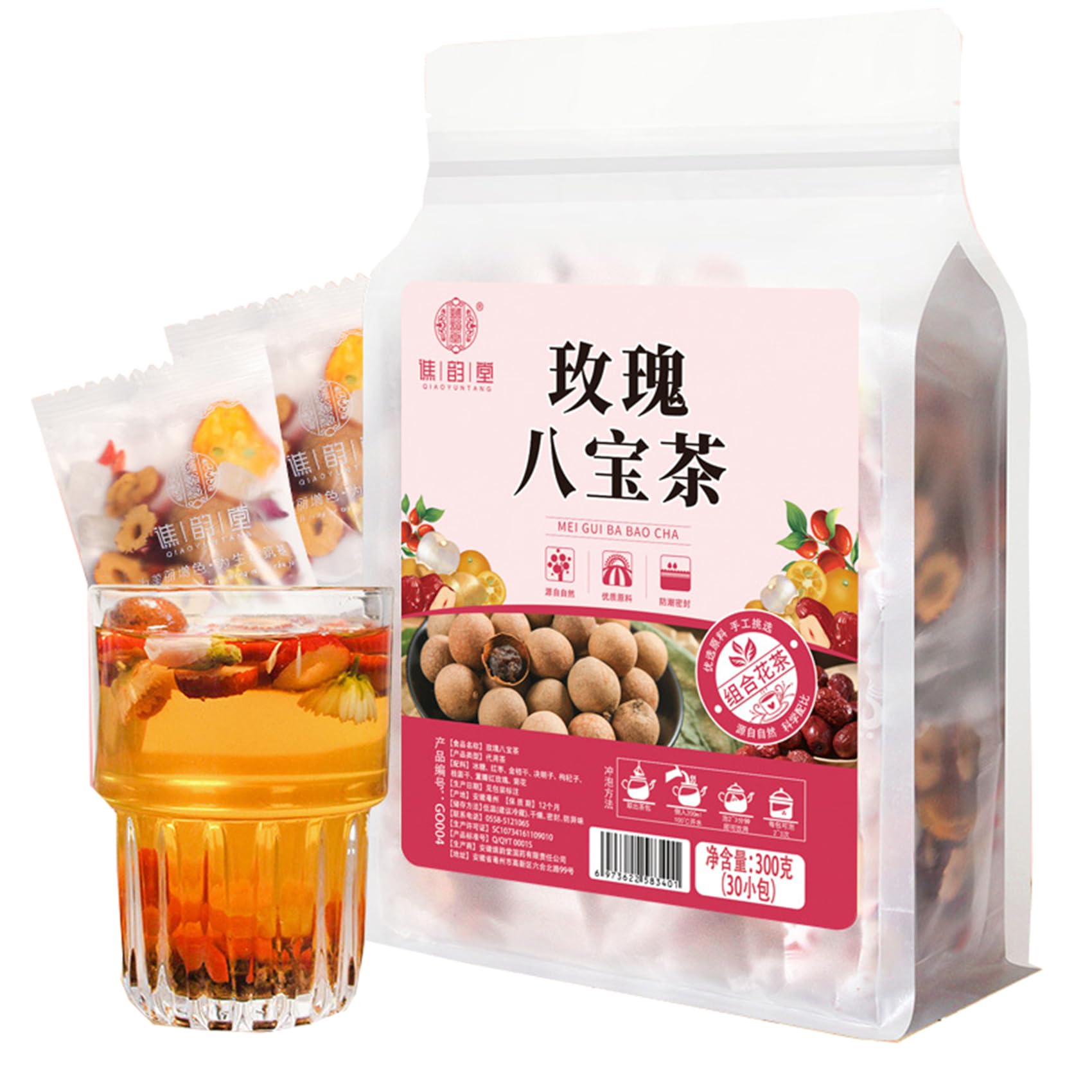 Rose Eight Treasure Tea is made by pairing double petal red roses, red dates, goji berries, chrysanthemums, longans, cassia seeds, dried kumquats, and rock sugar. It is brewed with water for daily consumption, and after drinking tea, the fruit pulp can be eaten, or opened in a bag and eaten as a snack. Transparent small packaging, fruit tea ingredients are clearly visible, one bag at a time, convenient for carrying and drinking.You can cover it and simmer for about 3-5 minutes. A rose eight treasure tea is ready to drink. Rose eight treasure tea has a sweet and refreshing taste, which will make you want to drink it again. Just brew the rose eight treasure tea until it has no taste. Fruit tea and pulp can be consumed!. Everyone must also pay attention to the technique of brewing rose eight treasure tea. It is recommended to use a covered bowl to brew. First, slowly pour boiling water along the edge of the covered bowl into the covered bowl, then pull up the kettle and let the eight ingredients in rose eight treasure tea roll in the boiling water to fully absorb the moisture. Because there are many raw materials in Rose Babao tea, when brewing Rose Babao tea, everyone must pay attention to using boiling water to brew Rose Babao tea, which is more conducive to releg the nutrients in Rose Babao tea. When drinking Rose Babao tea, you will find that the taste of each sip of tea is changing, which is also one of the great pleasures of drinking Rose Babao tea. Rose Babao tea with many ingredients has a rich tea soup and a rich taste. The biggest characteristic of Rose Babao Tea is its fragrant aroma, which makes people feel relaxed and happy when smelling it. When you taste this herbal tea, you will be attracted by its rich floral aroma, as if immersed in a sea of flowers, every sip filled with floral fragrance.