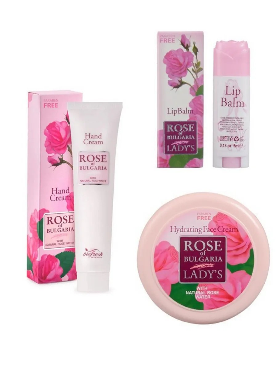 | Комплектация | Rose of Bulgaria Крем для рук и тела, парфюмированный увлажняющий,питательный; Rose of Bulgaria Крем для лица увлажняющий питательный с экстрактом розы; Rose of Bulgaria Бальзам для губ увлажняющий, с ароматом розы |