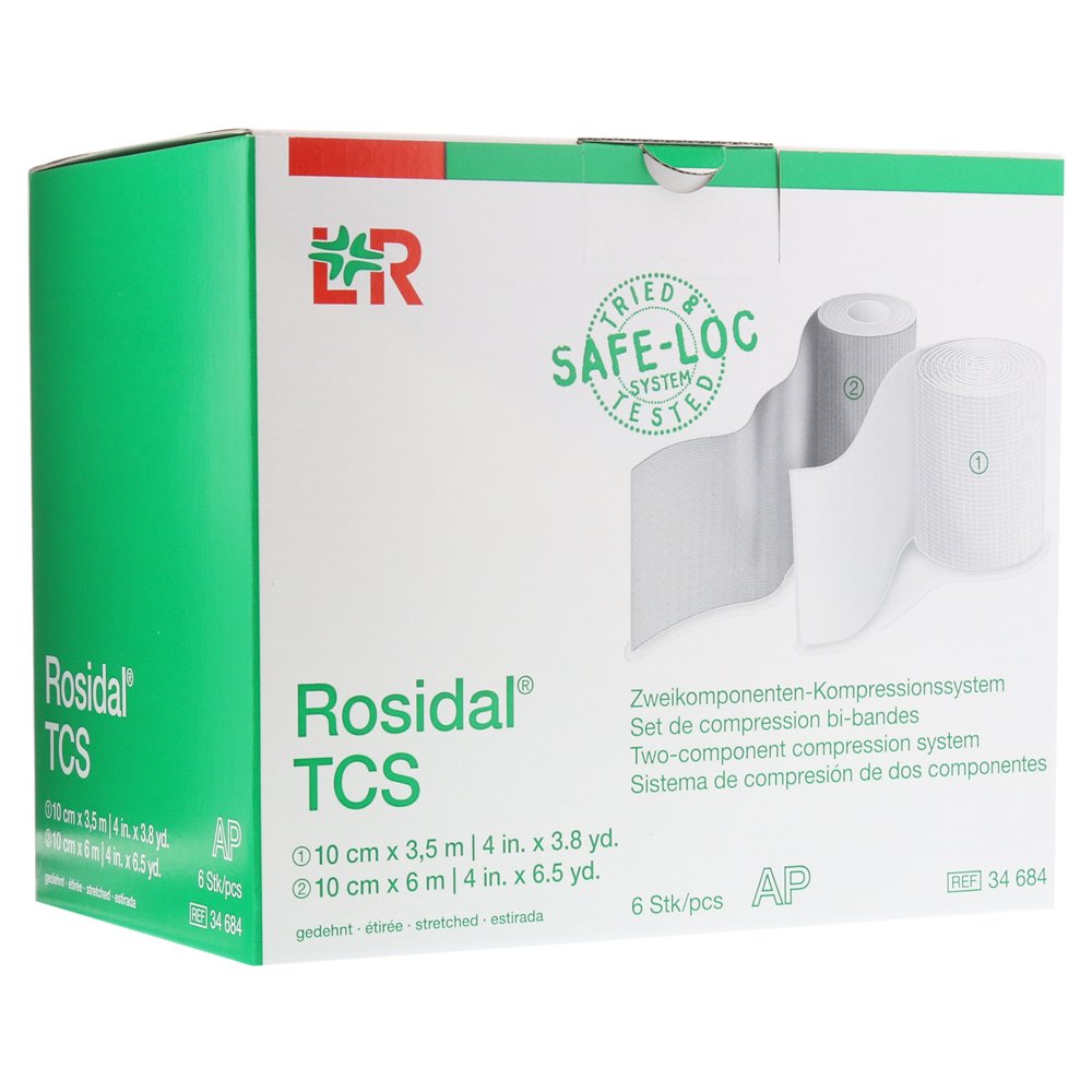An extensive range of compression bandages for all phases of the healing is available from Lohmann and Rauscher.Rosidal TCS is a conclusive overall concept, which implements the highest quality standards and ensures the greatest possible benefit and the best chances of recovery.Rosidal TCS - Two component system - is a combination of two products into a safe system.The compression system combines the components Rosidal SC and Rosidal CC.With the comfortable compression system, the low rest pressure is a clear plus, especially on the night.Product information for Rosidal TCS 6 Two-component compression systems for single use ready for consumption Hundred in set location 1 soft rosidal SC 10 cm x 3.5 m location 2 cohesive rosidal CC 10 cm x 6 m therapeutic work pressure for several days of integrated skin protection in the first location CHASIVEFree from natural rubberx easily without pressure indicators, the composite can be created in the Safe-Loc system.Pull 100 , wrap them up and you're done.Rosidal TCS offers high comfort through a upholstery compression bandage with integrated skin protection.The risk of slipping at high stiffness is reduced by a cohesive second compression bandage.She is liable for herself.The network Rosidal TCS hardly applies and can be carried out effortlessly in the shoe.Areas of application of Rosidal TCS therapy of the Ulcus Cruris Venosum and its companion diseases Handlaping of edema system under full train (Safe-Loc). LEGAL NOTICE Read the package supplement and ask your doctor or pharmacist for risks and side effects.