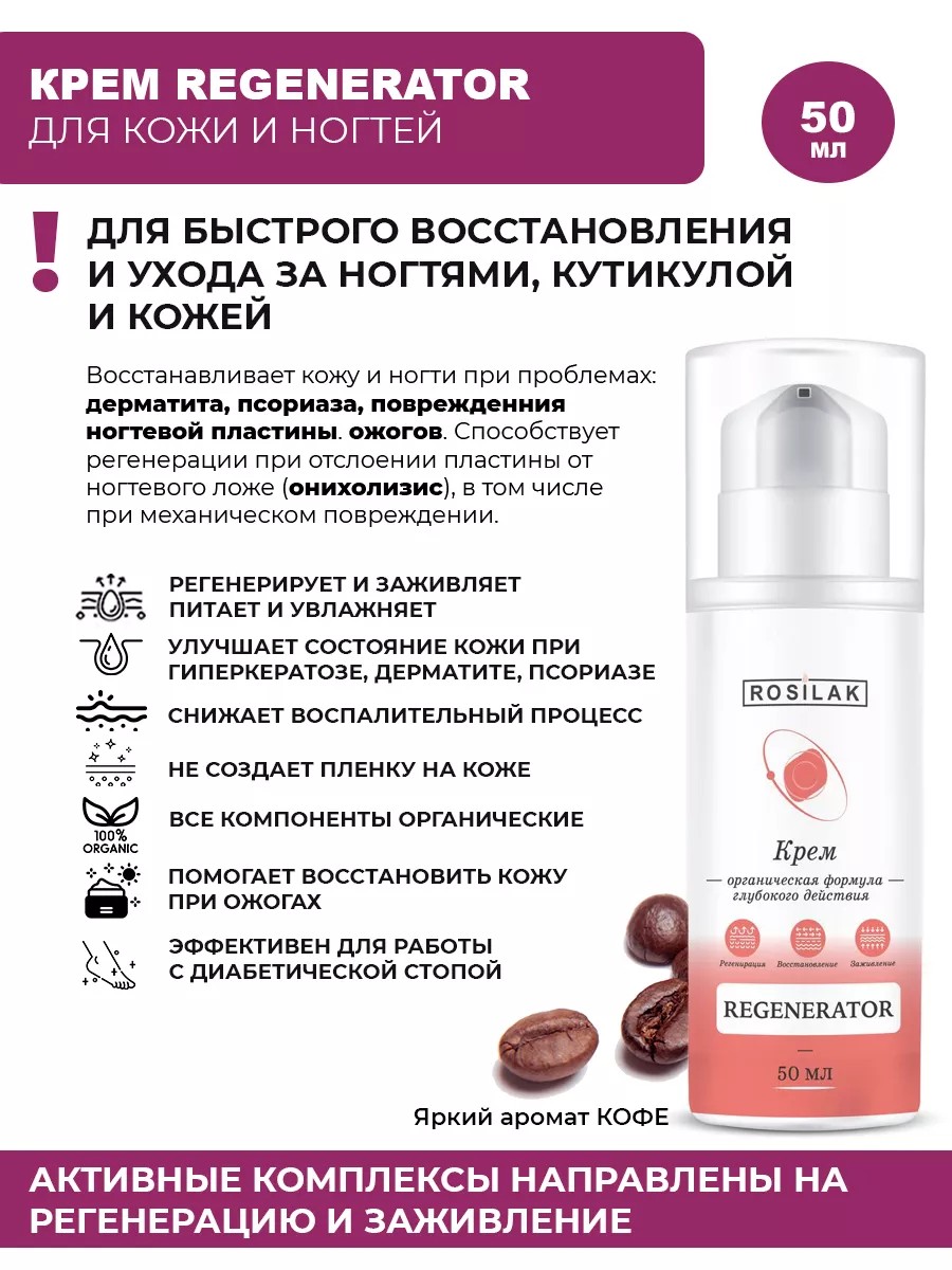 Уникальная формула глубокого восстановления и регенерации. Средство имеет гелевую форму, при этом состоит из масел и экстрактов. Это делает крем Regenerator максимально биодоступным для кожи, глубокая проницаемость обусловлена высоким содержанием витамина Е. Каждый компонент органического происхождения, что делает крем безопасным для применения на поврежденной и травмированной коже. Активные комплексы направлены на регенерацию и заживление, быстрое восстановление и увлажнение. Регенерирует и заживляет. Питает и увлажняет. Улучшает состояние кожи при гиперкератозе. Снижает воспалительный процесс. Не создает пленку на коже. Все компоненты органические. Помогает восстановить кожу при ожогах. Эффективен для работы с диабетической стопой. Крем обладает высокой проницаемостью, воздействуя на проблему комплексно.