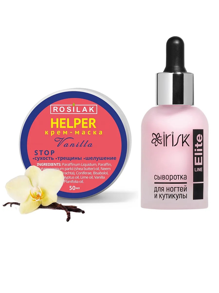| Комплектация | Helper Vanilla - крем-маска для ног, 50 мл; Elite line - сыворотка с наночастицами золота для ногтей и кутикулы (002), 30 мл |