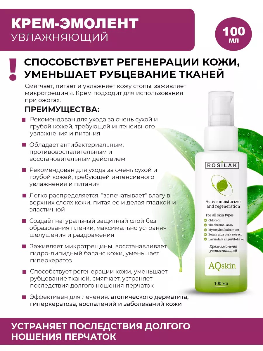Aqskin Крем-эмолент - антибактериальное и противовоспалительное средство для ухода за очень сухой и грубой кожей, требующей интенсивного увлажнения и питания. Эффективно справляется атопическим дерматитом, гиперкератозом, различными воспалениями и заболеваниями кожи. Крем является универсальным, он подходит для всех участков кожи, включая уход за стопой и пятками.
