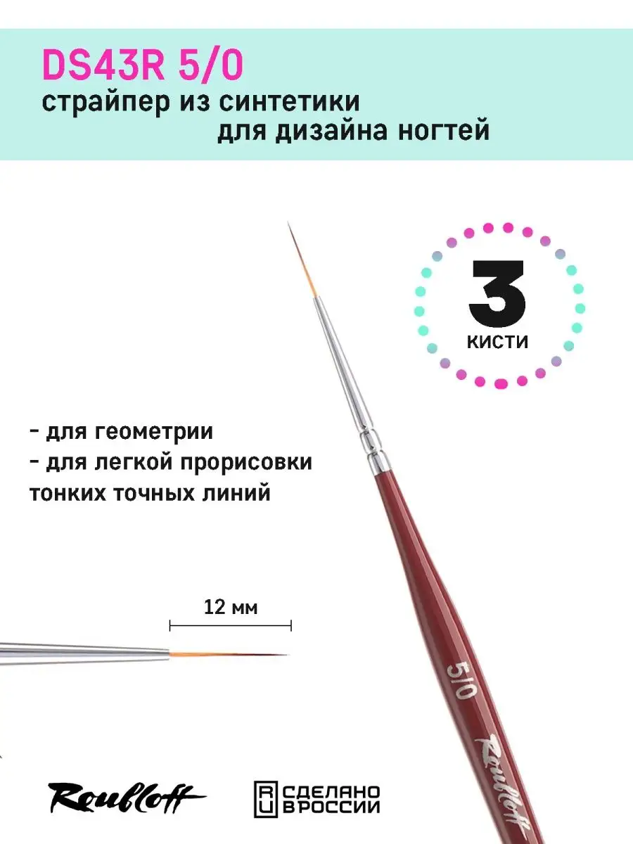 Набор из трех профессиональных кистей для маникюра: Страйпер Roubloff DS43R №5/0 идеально подходит для геометрии и выведения тонких длинных линий, для глубокой прорисовки, декорирования и рисования на ногтях.
