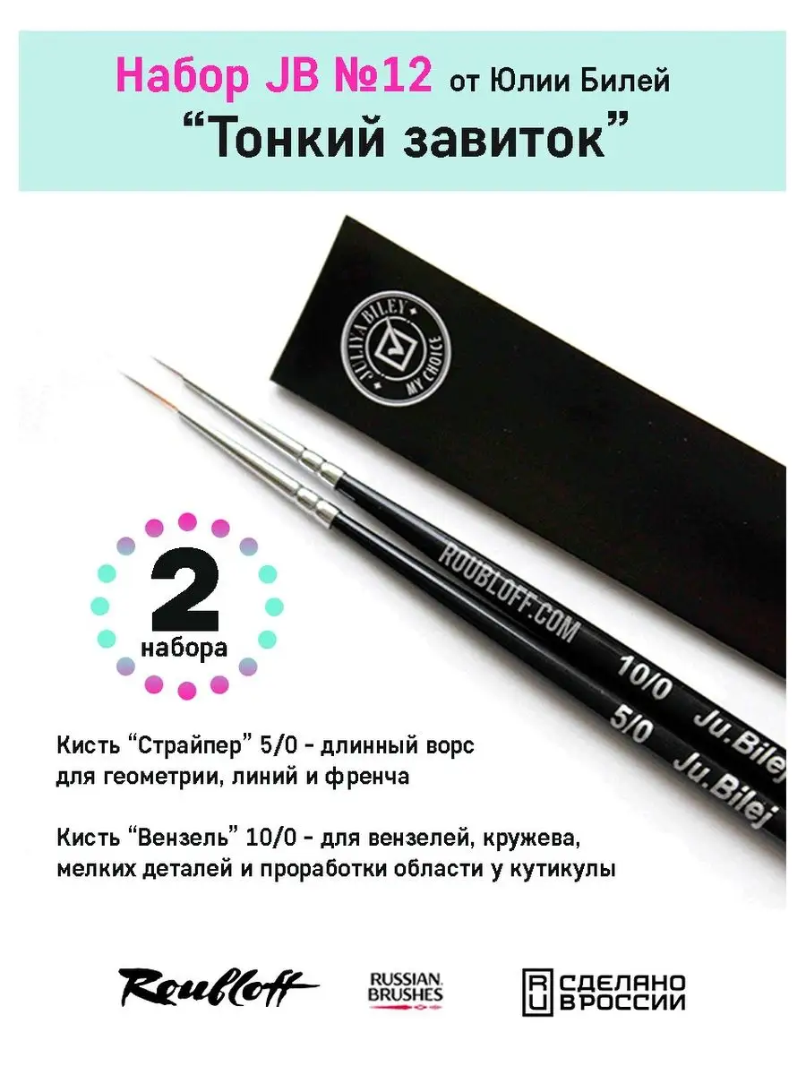 Набор кистей Roubloff для маникюра станет прекрасным дополнением для любого нейл мастера. Набор состоит из 2х кисточек: Страйпер и Вензель. Кисти рублев идеальны для прорисовок тонких линий и выполнения графических дизайнов. Подходят для рисования френча, а так же лунного маникюра и раффиан-маникюра (выделение области возле кутикулы). Разработаны Юлией Билей. Профессиональные кисти рублефф рекрасно поведут себя в работе с гель лаками и гель красками. Ими удобно заводить материал под кутикулу. Профессиональный мастер маникюра с помощью данного набора легко выполнит любой дизайн для ногтей.