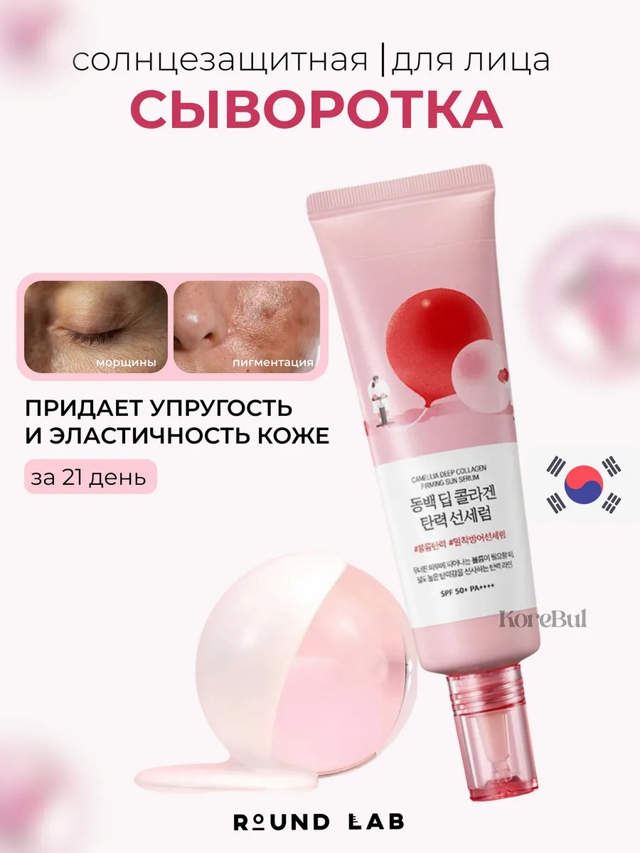 Round Lab Camellia deep Collagen sun serum SPF50+ PA++++ обеспечивает осветление кожи, борьбу с морщинами и блокировку УФ-излучения.