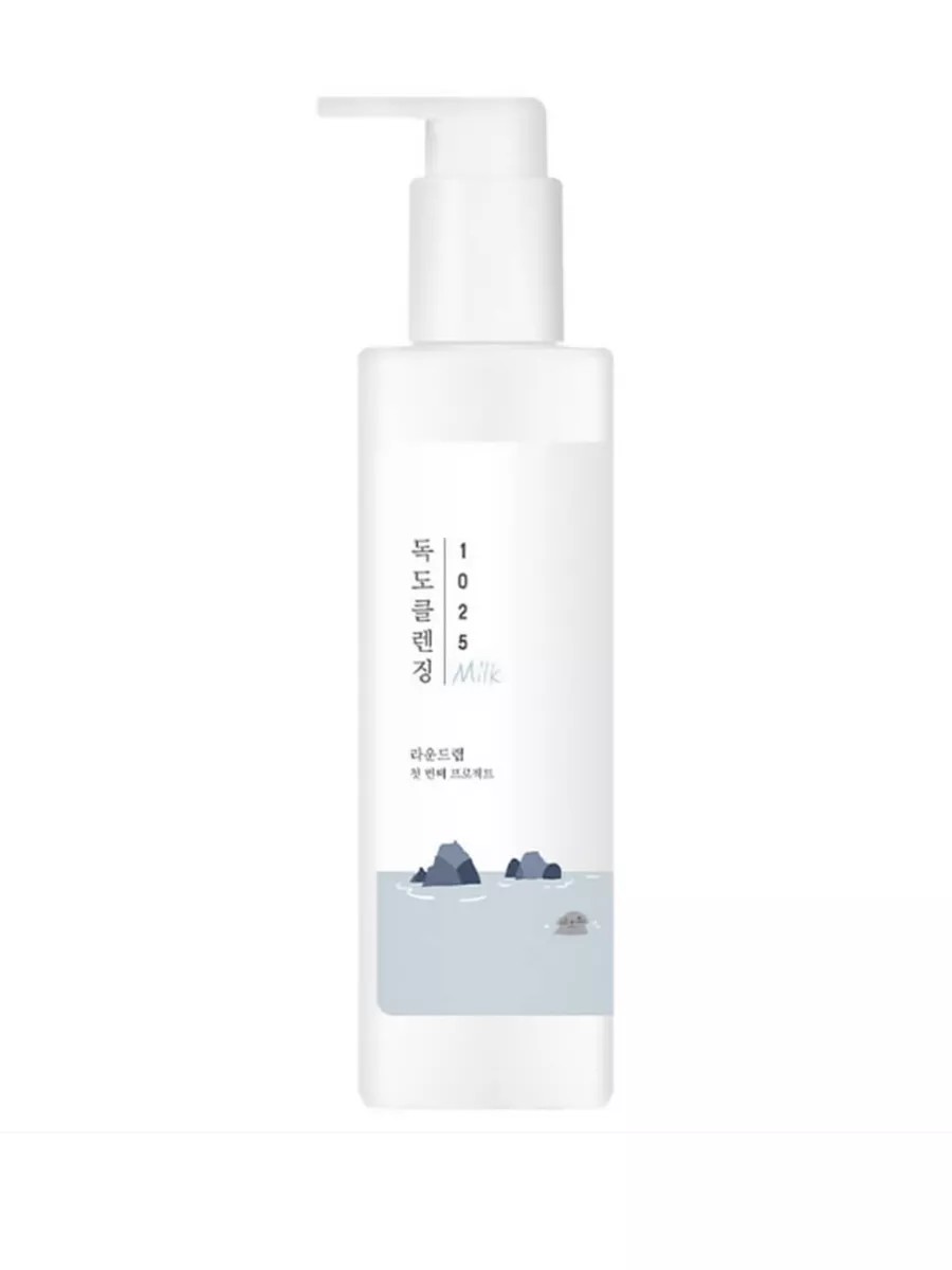 Round Lab 1025 Dokdo Cleansing Milk gently yet thoroughly removes makeup, sunscreen, foundation, and impurities, soothing and softening the skin.