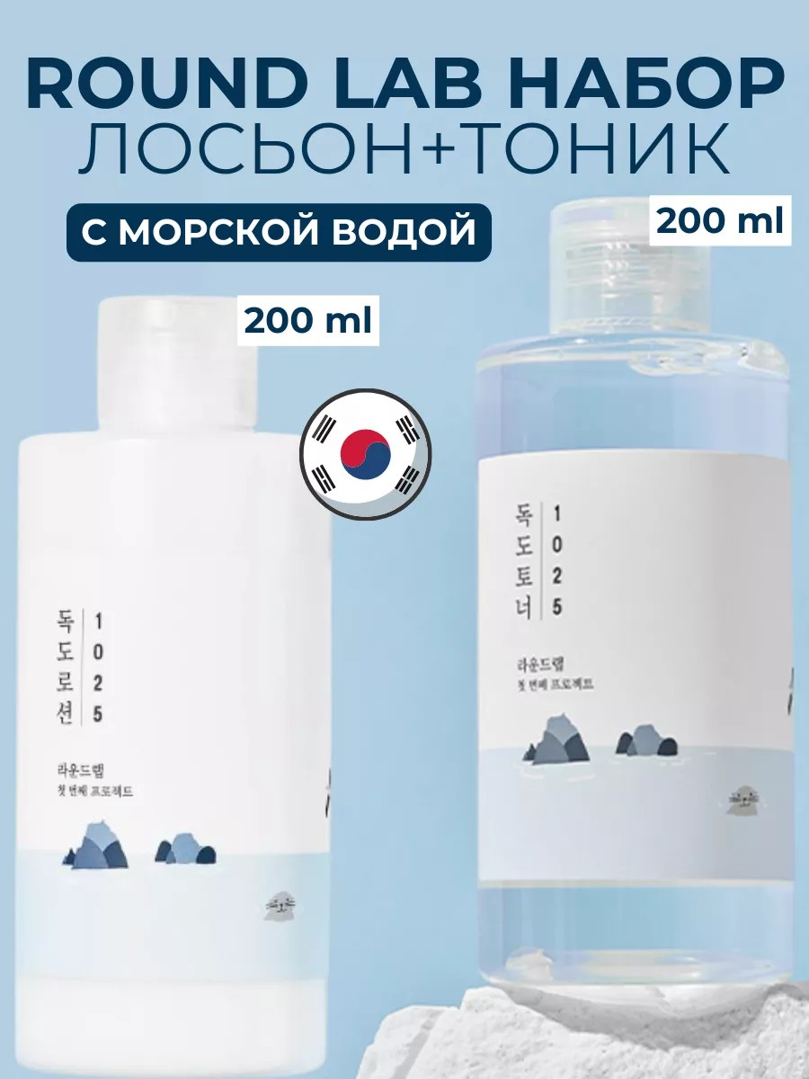 | Комплектация | Отшелушивающий тоник с морской водой Round Lab 1025 Dokdo Toner, 200 мл - 1 шт.; Лосьон для интенсивного увлажнения кожи с морской водой Round Lab 1025 Dokdo Lotion, 200 мл - 1 шт. |