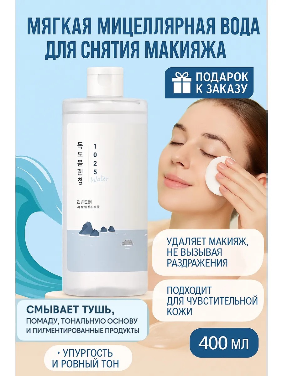 Мягкая мицеллярная вода Round Lab 1025 Dokdo Cleansing Water благодаря гипоаллергенной формуле удаляет макияж, не вызывая раздражения и сухости, подходит для чувствительной кожи.