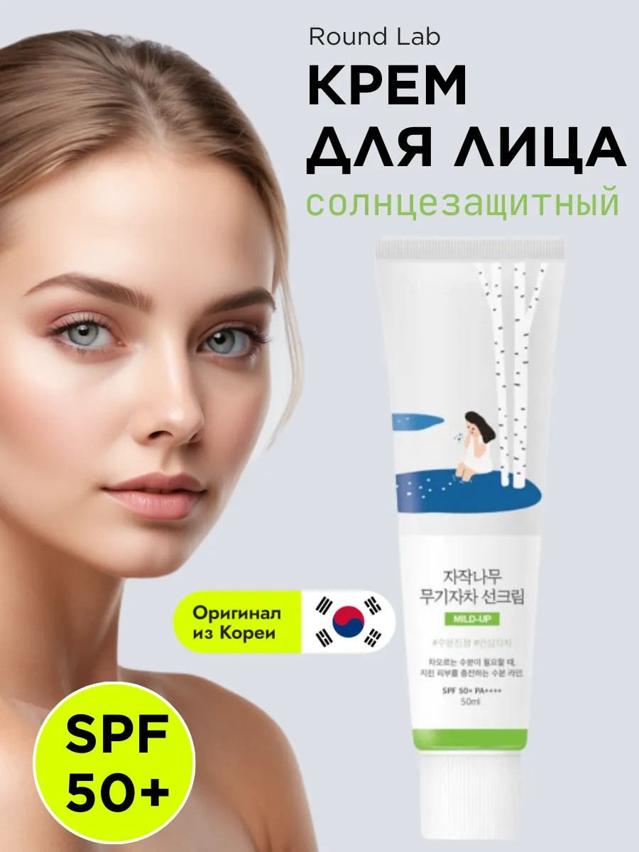 Санскрин с берёзовым соком Round Lab Birch Juice Moisturizing Mild-Up Sunscreen SPF50+ PA++++ отлично защищает чувствительную кожу от ультрафиолета, предотвращает покраснение и появление ожогов, препятствует фотостарению.