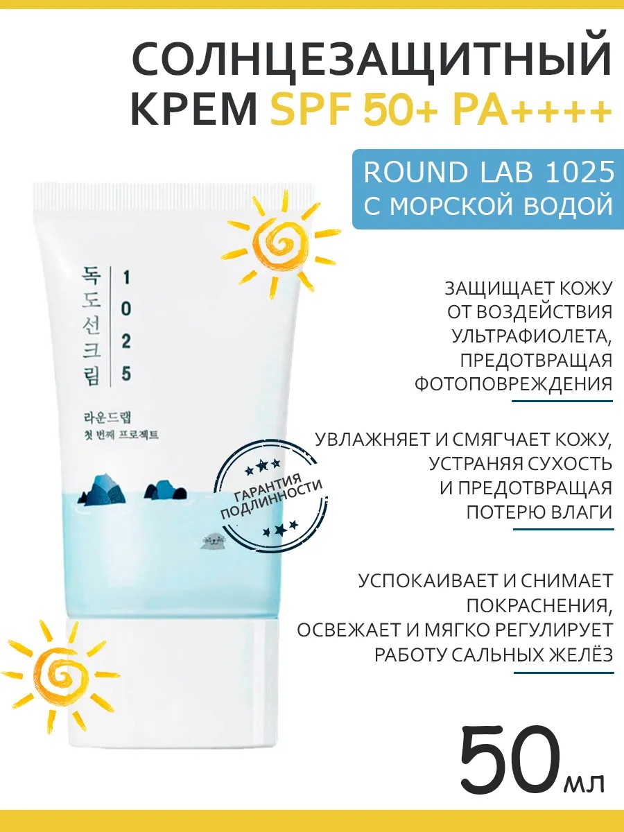 Солнцезащитный крем с морской водой Round Lab 1025 Dokdo Sunscreen SPF50+ PA++++ защищает кожу от воздействия ультрафиолета, предотвращая фотоповреждения, увлажняет и смягчает кожу, устраняя сухость и предотвращая потерю влаги. Успокаивает и снимает покраснения, освежает и мягко регулирует работу сальных желёз.