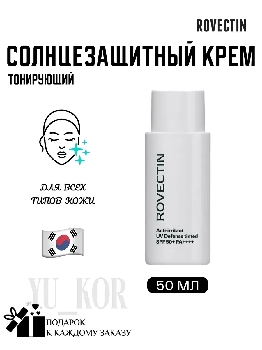 Anti-Irritant UV Defense Tinted SPF 50+ PA+++ Солнцезащитный крем ТМ ROVECTIN Содержит минеральные фильтры и обеспечивает защиту от всех видов УФ-лучей (UVA & UVB).