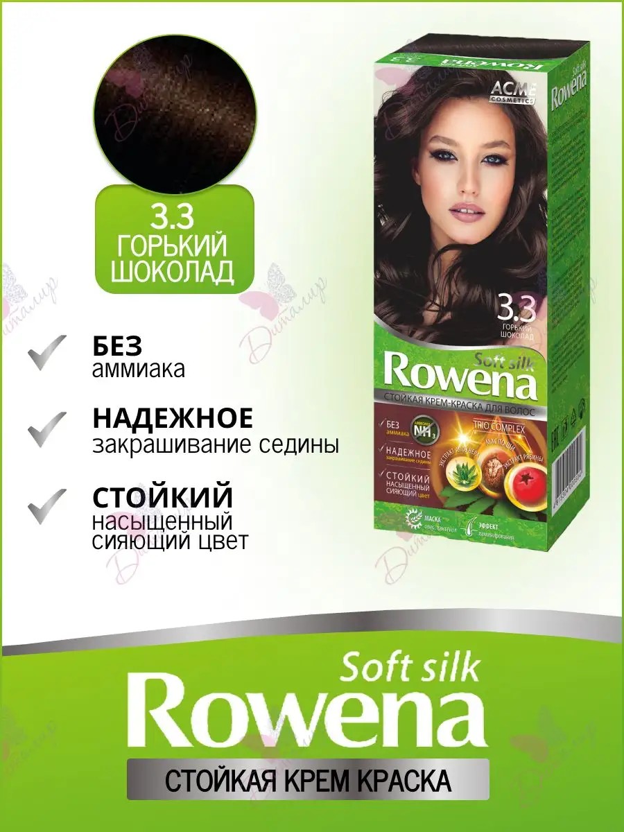 Крем краска Rowena Silk Soft не содержит аммиак, при этом призвана обеспечить волосам стойкий насыщенный цвет и максимальное закрашивание седины. Кремовая текстура краски разработана таким образом, чтобы мягко и деликатно, минимизируя повреждения, проникать в структуру волоса, при этом окрашивая их в сочный, объемный, яркий цвет. Входящие в состав экстракт рябины, экстракт алое и масло ши интенсивно ухаживают за волосами в процессе окрашивания: питают и восстанавливают, придают гладкость, шелковистость. Маска с маслом овса и пантенолом великолепно завершает процедуру окрашивания: закрепляет цвет, увлажняет и питает, делает волосы гладкими и блестящими. РЕЗУЛЬТАТ: стойкий насыщенный сияющий цвет волос без седины.