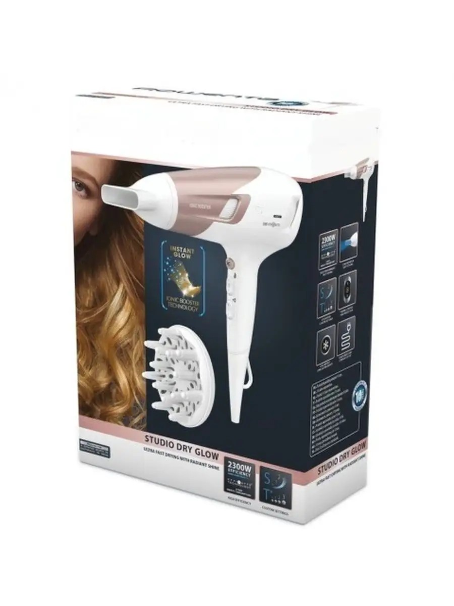 The Rowenta Studio Dry Glow CV5830F0 hair dryer will provide your hair with professional care. It features a powerful yet energy-efficient motor for fast drying and energy savings. INTUITIVE CONTROLS: Two rocker controls allow you to select your preferred temperature and air flow speed, allowing you to adjust six different settings. For example, use the Thermo Control mode to protect your locks from overheating. The ultra-cool air setting will help you set your style. COMPLETE KIT: In addition to the hair dryer itself, the set includes two attachments: a diffuser and a concentrator. The diffuser is designed to disperse the air flow, while the concentrator directs it to a specific section of your hair. HASSLE-FREE CARE: The Rowenta Studio Dry Glow CV5830F0 is extremely easy to maintain. To do this, periodically remove the magnetic mesh cover from the air intake vent and clean it from accumulated hair and dust.
