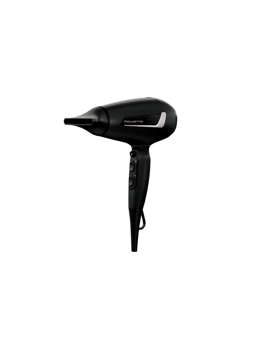 The Rowenta CV8810F0 hair dryer operates on a 220V power supply. The AC motor consumes 2100W. It weighs 730g and measures 298x18.2x9.2cm. The black plastic housing features a hanging loop.