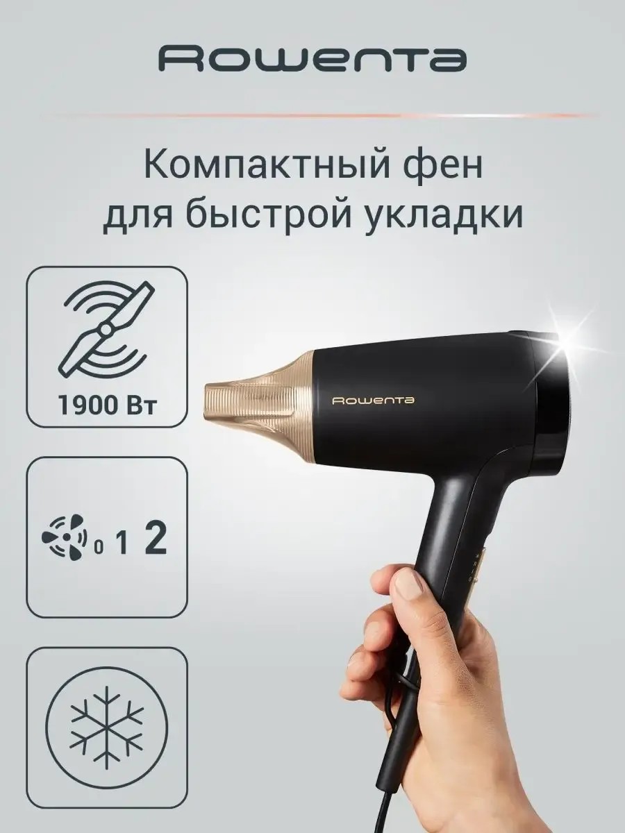 Фен для волос Rowenta EXPRESS STYLE CV1804F0. Эффективная сушка с меньшим потреблением энергии — откройте для себя производительность, на которую вы можете положиться каждый день, благодаря передовой технологии effiwatt, являющейся ключом к легкой повседневной укладке. Фен эффективен и компактен без ущерба для производительности, что делает его идеальным помощником для укладки волос на ходу. Зафиксировать укладку можно благодаря функции «Холодный обдув». На обратной части корпуса находится защитная решетка. Благодаря тщательно продуманной эргономике эта модель отлично лежит в руке, а кнопки управления расположены таким образом, чтобы вы быстро могли найти нужную.
