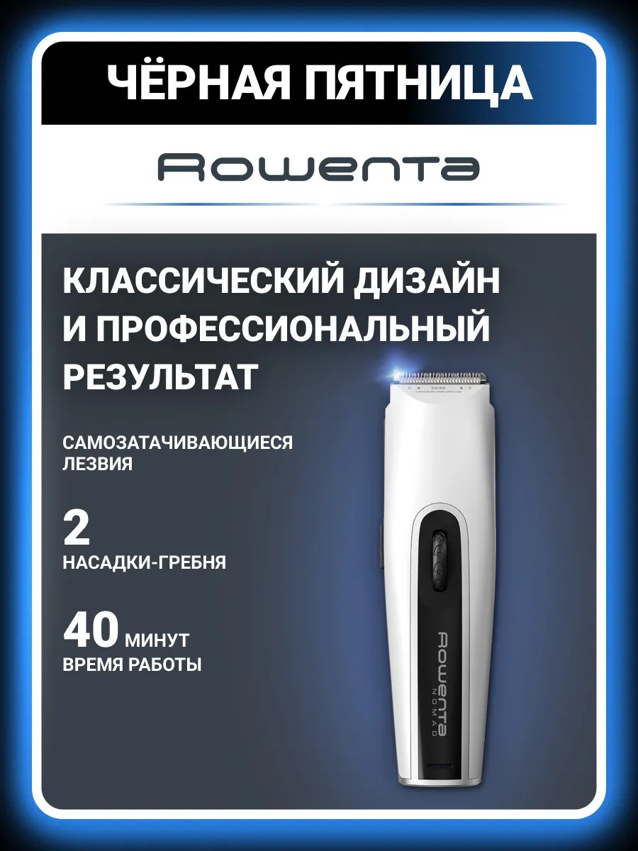 The Rowenta TN1400F1 is a convenient and easy-to-use hair clipper from the Nomad series. It's designed for home use, but its built-in battery makes it perfect for travel. The developers have included the ability to adjust hair length while cutting. The length adjustment accuracy is 1.5 mm, with length adjustments from 3 mm to 30 mm. The stainless steel blades guarantee precise cutting. Stainless steel is a strong and durable material. The clipper is equipped with a built-in battery, providing up to 40 minutes of cordless operation. The clipper comes with two adjustable attachments, lubricating oil, a cleaning brush, and a charger.