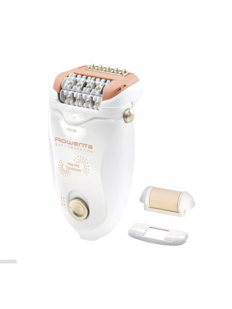 The painless Rowenta Soft Sensation epilator is a unique combination of delicate, feminine design and advanced technology. The key feature of this line is Pain-Free technology, which, thanks to the high-frequency movement of the massage plate and multiple pulses, blocks the pain signal and ensures comfortable use without irritation and pain. The movable head with built-in lighting follows the contours of your body and provides gentle skin care. A special peeling attachment removes dead skin particles and keeps it soft and radiant. The epilator's removable attachments are easy to use, easy to change, and washable under water.