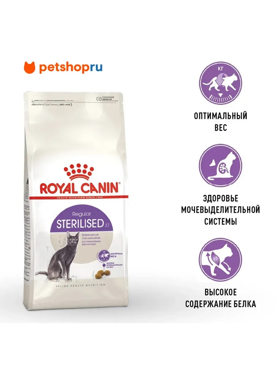 Формула сухого корма Royal Canin Sterilised 37 (Стерилайзд 37) поддерживает оптимальный вес, мышечную массу и здоровье мочевыделительной системы стерилизованных кошек.