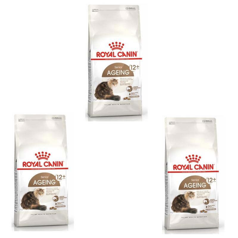 Aging cats have different nutritional needs than young cats. Therefore, it is important to adapt the cat's diet to its increg age. This ensures that your needs are met. ROYAL CANIN AGEING 12+ is ideal for cats aged 12 and over. The cat food is specially designed to meet the special needs of older cats and contains very tasty croquettes with a double texture (crispy on the outside, soft inside), which can help stimulate the appetite of older cats. ROYAL CANIN AGEING 12+ contains an antioxidant complex that can help senior cats support throughout their ageing process. Thanks to a moderate phosphorus content, healthy kidney function can also be contributed, which is a very important aspect, especially for older cats. To meet the individual preferences of each cat, ROYAL CANIN AGEING 12+ is also available as juicy pieces in sauce or jelly. If you are considering mixed feeding of dry and wet food, simply follow our feeding guidelines. This ensures your cat gets the right amount of wet and dry food. INDICATIONS Senior, urinary tract problems, kidney supply INGREDIENTS Composition: wheat glue*, wheat flour pre-cooked, animal fat, poultry protein dried, rice, corn, vegetable fibres, hydrolysed animal proteins, chicory pulp, minerals, fish oil, soybean oil, yeast products, dried tomato pulp (source of lycopene), fructo-oligosaccharides, psyllium (peel and seeds). yyyyyyyfor Mannan oligosaccharides), glucosamine from fermentation, borage oil, tagete flour, cartilage hydrolyzed (source of chondroitin) DIRECTIONS Cat weight ideal weight overweight 3 kg 42 g (23 g + 1 fresh bag) 33 g (15 g + 1 fresh bag) 4 kg 51 g (33 g + 1 fresh bag) 41 g (22 g + 1 fresh bag) 5 kg 60 g (41 g + 1 4. Fresh bag) 4. 8 g (29 g + 1 fresh bag), 6 kg 68 g (50 g + 1 fresh bag), 54 g (36 g + 1 fresh bag) See moreHealthy kidneys – often a decrease in kidney function can be observed in older cats. AGEING 12+ can help support kidney function through an adapted phosphorus content. Healthy urinary tract – Royal Canin Senior Aging 12+ has been specially developed to support urinary tract health in adult cats. Appetite stimulating – Ageing 12+ can help stimulate the appetite of the senior cat thanks to a particularly tasty and easy to chew croquette with double texture. Nutrition needs – Aging cats have different nutritional needs than young cats. Therefore, it is important to adapt the cat's diet to its increg age. Complete food – Royal Canin Senior Aging 12+ is a complete food for cats – especially for senior cats from the 12th year of age in the form of dry food.