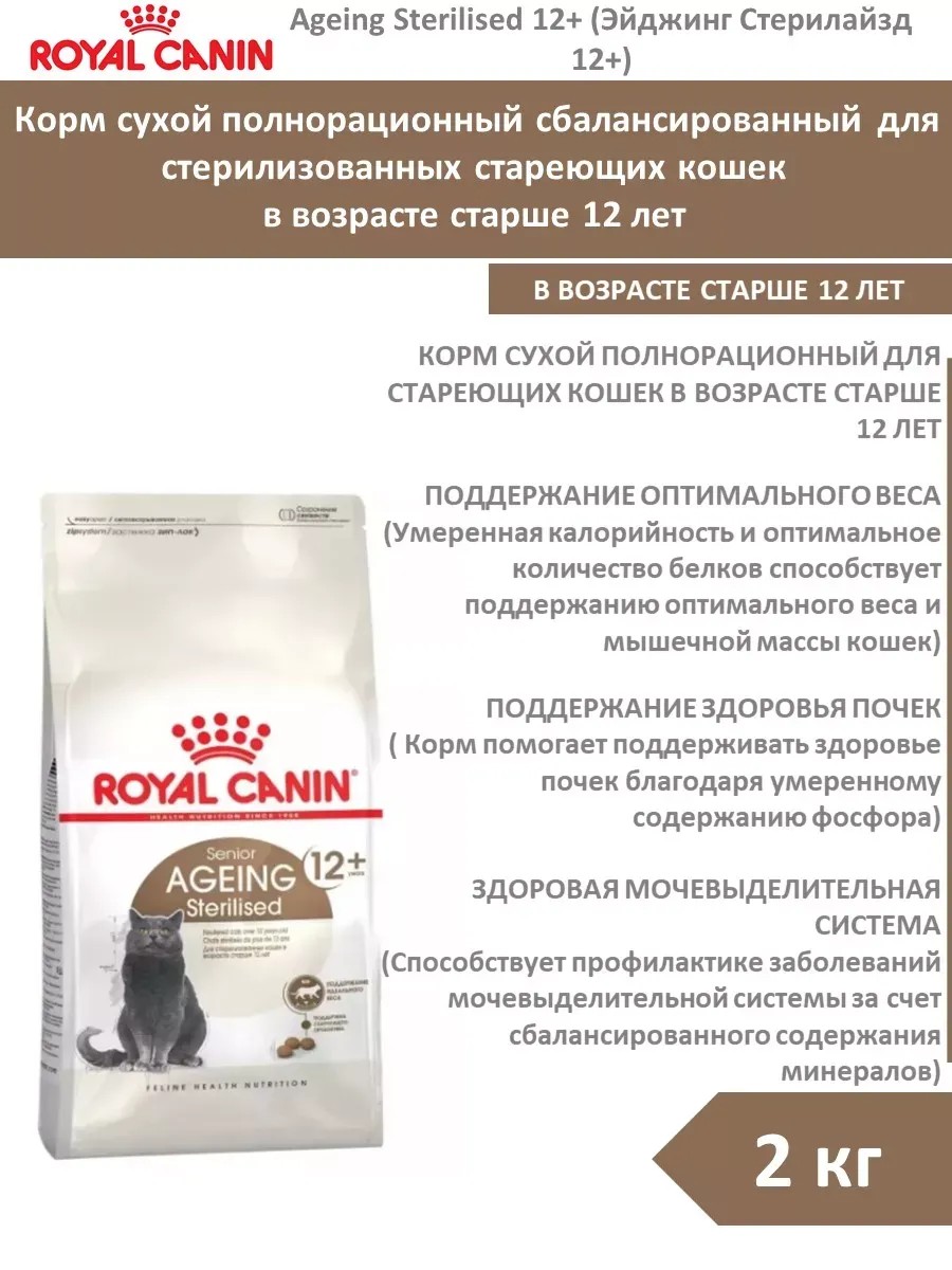 Корм сухой полнорационный сбалансированный для стерилизованных стареющих кошек Royal Canin Ageing Sterilised 12+, 2 кг (Роял Канин Эйджинг Стерилайзд 12+), в возрасте старше 12 лет. Сухой полнорационный корм для стерилизованных кошек в возрасте старше 12 лет. Рацион ROYAL CANIN Ageing Sterilised 12+ (Эйджинг Стерилайзд 12+) учитывает особые потребности стерилизованных стареющих кошек и способствует: поддержанию здоровья и активности; поддержанию оптимального веса; поддержанию здоровья почек; поддержанию здоровая мочевыделительной системы ; 100% полнорационное и сбалансированное питание. Специальный комплекс питательных веществ, содержащийся в рационе ROYAL CANIN Ageing Sterilised 12+ (Эйджинг Стерилайзд 12+), включающий комбинацию антиоксидантов (в т.ч. ликопин), триптофан и жирные кислоты Омега-3, помогает замедлять процессы старения и поддерживает активность кошек в пожилом возрасте.Физическая активность некоторых кошек с возрастом снижается, что может привести к набору избыточного веса. Благодаря умеренной калорийности и оптимальному уровню белков продукт помогает поддерживать оптимальный вес и мышечную массу пожилых кошек.Также с возрастом нередко ослабевает функция почек. Благодаря умеренному содержанию фосфора ROYAL CANIN Ageing Sterilised 12+ (Эйджинг Стерилайзд 12+) поддерживает функцию почек и здоровье мочевыделительной системы пожилых кошек.