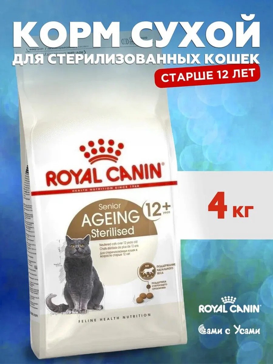 Корм сухой полнорационный для кошек - Специально для стерилизованных кошек в возрасте старше 12 лет AGEING STERILISED 12+ ROYAL CANIN, подходящий для стерилизованных кошек в возрасте старше 12 лет, специально разработан с учетом потребностей вашей кошки в питательных веществах.