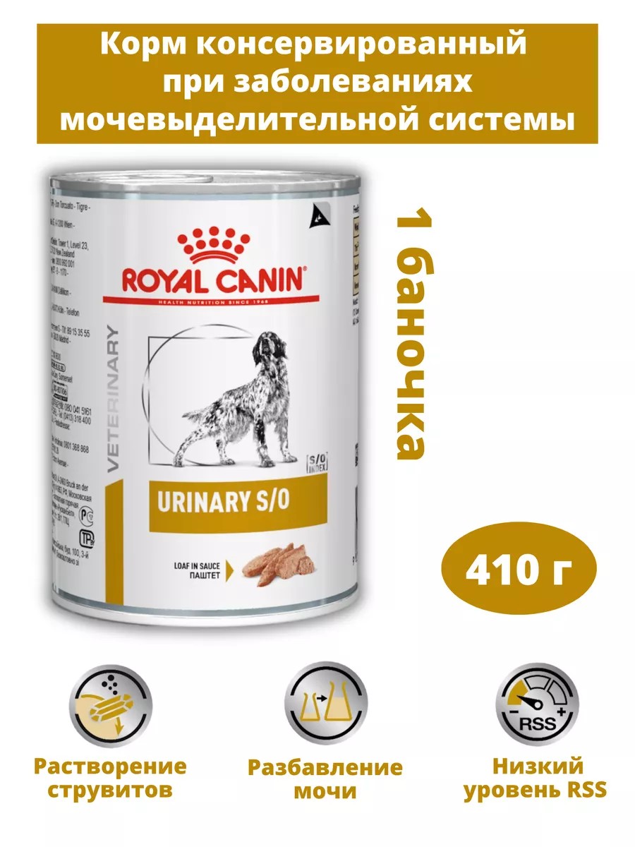 Be careful when ordering the product! The number of cans is indicated in the photo and in the ! Canned complete dietary food for dogs suffering from urolithiasis ROYAL CANIN URINARY S / O (ROYAL CANIN URINARI S / O) 410 grams - 1 can.