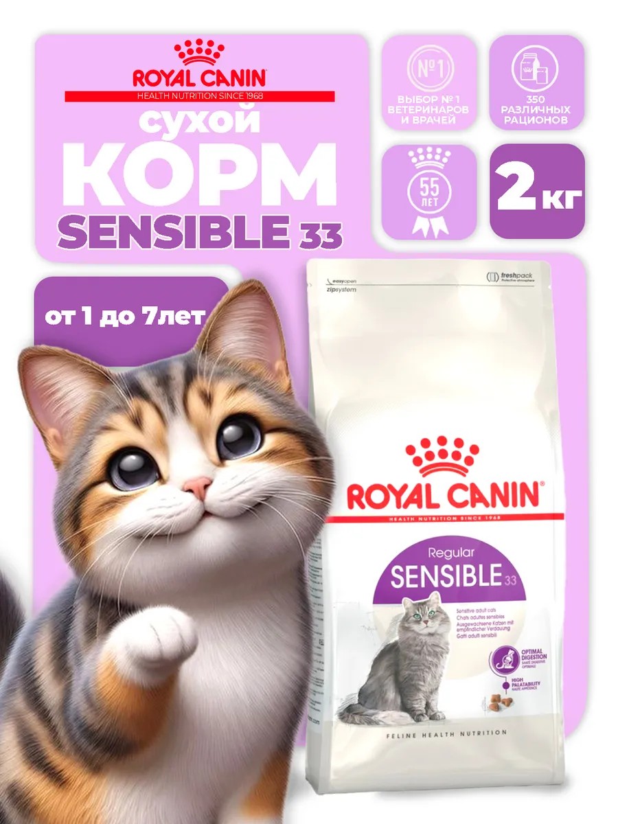 Корм сухой полнорационный сбалансированный для взрослых кошек (в возрасте старше 1 года) с чувствительной пищеварительной системой SENSIBLE 33 (СЕНСИБЛ 33) ROYAL CANIN, подходящий для кошек в возрасте от 1 года до 7 лет с чувствительной пищеварительной системой специально разработан с учетом потребностей вашей кошки в питательных веществах
