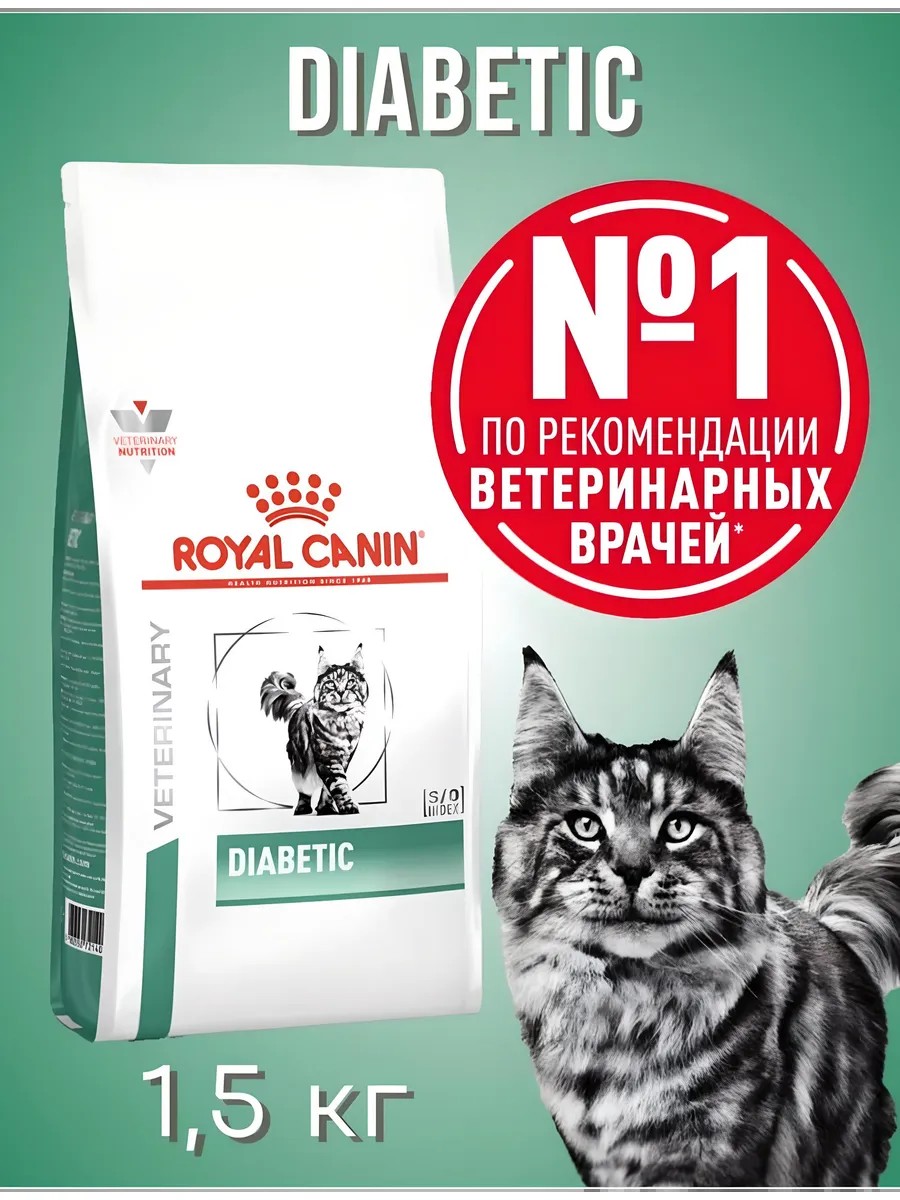 Сухой диетический корм Diabetic ( Диабетик ) премиум класса Royal Canin Veterinary Diets для кошек при сахарном диабете, 1.5 кг Ваша кошка - член вашей семьи, и вы хотите сделать все, чтобы она чувствовала себя хорошо! Ветеринарная диета Роял Канин имеет преимущества: Контроль содержания сахаров: Специальная формула продукта, обеспечивающая контроль уровня постпрандиальной гликемии у питомцев больных диабетом. Стабилизирует уровень сахара в крови, что так важно для диабетиков. Высокое содержание белка: Повышенное содержание белка. Поддержание мышечной массы крайне важно для кошек, страдающих избыточным весом. Пониженное содержание крахмала: Диета с пониженным содержанием крахмала. Умеренное содержание энергии: Умеренная калорийность позволяет бороться с избыточным весом. Сбалансирован по питательным веществам, чтобы обеспечить вашего питомца всеми необходимыми для здоровья витаминами и минералами. Рояль Конин обогащен L-карнитином. Высокий уровень антиоксидантов помогает предотвращать развитие осложнений. Высокое содержание клетчатки поддерживает работу ЖКТ. Имеет вкусный и ароматный состав, что сделает процесс кормления приятным и комфортным для вашего любимца. Подходит для всех пород, для кастрированных и стерилизованных в том числе. 1.5 кг - оптимальный размер упаковки с зип замком, что позволит вам легко хранить корм и быть уверенными, что у вашего питомца всегда будет свежая порция. Также есть упаковка пакетик 400г. Противопоказания: