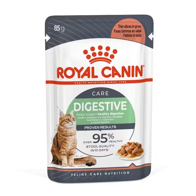 ROYAL CANIN Digestive Care in Gravy is a nutritionally complete and balanced formula specially designed to help support healthy digestion.Thanks to its precisely balanced nutrients, this formula also helps to support healthy stool quality. ROYAL CANIN Digestive Care has proven results. Our study* showed that participating cats achieved over 95% healthy stool quality in just 10 days of being fed with the Digestive Care nutritional programme (combining both the dry kibble and wet food formulas). ROYAL CANIN Digestive Care is also available as a dry kibble diet. A mixture of both wet food and dry food provides the variety cats love. *Royal Canin internal study. INDICATIONS Adult INGREDIENTS Meat and animal derivatives, cereals, minerals, derivatives of vegetable origin, vegetable protein extracts, yeasts DIRECTIONS Complete food for adult cats See more