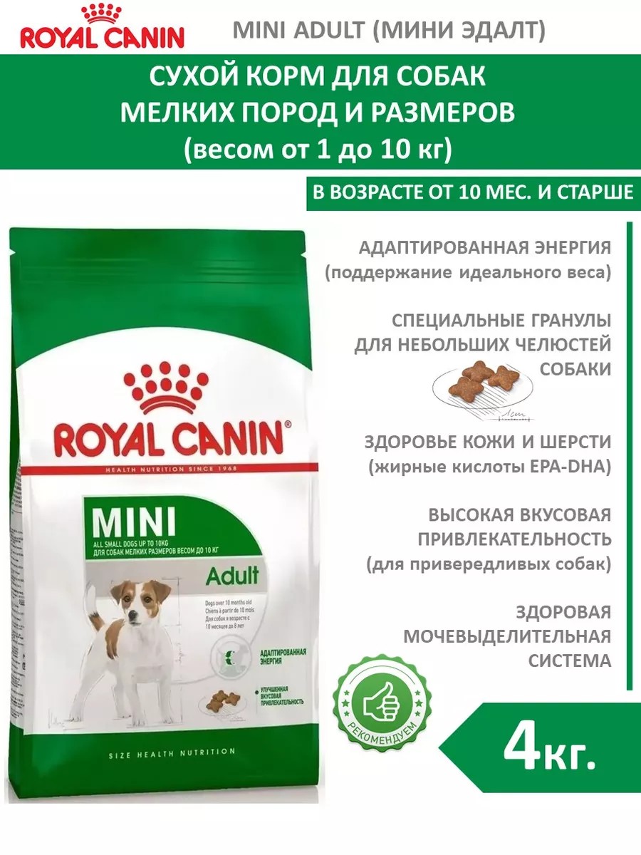 Мини Эдалт - сухой корм для собак в возрасте c 10 месяцев до 8 лет. ROYAL CANIN MINI Adult (Мини эдалт) специально разработан для собак мелких пород (весом от 1 до 10 кг). В питании собак мелких пород важен не только адаптированный размер крокет. Им требуется больше энергии, чем крупным собакам, период роста у них короче, а сам рост – интенсивнее. Как правило, они живут дольше, чем крупные собаки, и отличаются большей привиредливостью в питании. Помогает поддерживать оптимальный вес. Высокая вкусовая привлекательность: даже для привередливых собак. Поддерживает здоровье кожи и шерсти. Способствует здоровью зубов, учитывает миниатюрные размеры челюстей. 100% полнорационное и сбалансированное питание.Предназначен для собак мелких пород (весом до 10 кг) старше 10 месяцев и разработан с учетом потребностей взрослой собаки в питательных веществах. Собаки мелких пород отличаются высокой потребностью в энергии, поэтому продукт содержит достаточное количество жиров и L-карнитин, которые помогают животному поддерживать высокий уровень энергии, и при этом сохранять оптимальный вес. Эксклюзивная формула продукта обеспечивает его высокую вкусовую привлекательность, удовлетворяя предпочтения даже привередливых в питании собак, часто встречающихся среди представителей мелких пород. Благодаря высоким вкусовым качествам продукт удовлетворит даже самый взыскательный аппетит. Содержит комплекс нутриентов, необходимых для поддержания здоровья кожи и шерсти животного. Для удовлетворения индивидуальных предпочтений каждой собаки выпускается также в формате влажного продукта – аппетитных кусочков в соусе. Если вы выбрали для своей собаки смешанное питание, следуйте рекомендованным нормам кормления, чтобы сочетать сухой и влажный продукт в пропорциях, оптимальных для здоровья животного. royal canin для стерилизованных. корм для собак роял канин для мелких пород.роял канин для собак мелких пород сухой.royal canin для собак mini.корм для собак мелких пород сухой премиум.