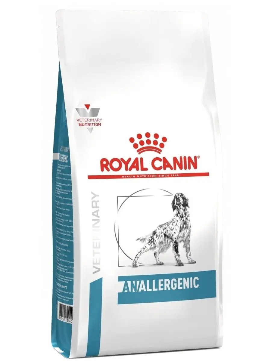 Royal Canin for dogs dry Analergenic complete dietary for adult dogs, used for food allergies or food intolerances. Royal Canin for dogs Veterinary diet. The product formula and its production process are aimed at eliminating sources of food allergens. The formula helps maintain the skin's natural protective barrier. Indications: Adverse food reactions (AFRs) with dermatological and/or gastrointestinal symptoms: diagnosis (elimination study), dietary therapy, atopic dermatitis combined with AFRs, inflammatory bowel disease (IBD). Contraindications: pregnancy, lactation, growth, pancreatitis. RECOMMENDATION: A decision on the duration of dietary therapy or a change in diet should only be made on the recommendation of a veterinarian. If a food allergy or food intolerance is suspected, the dog should be transferred to a special diet without a transition period. Royal Canin Anallergenic dry food for dogs can be used throughout the animal’s life. It is recommended to divide the daily portion of food into two meals. ADDITIVES (per 1 kg): Nutritional additives: Vitamin A: 36500 IU, Vitamin D3: 800 IU, Iron: 42 mg, Iodine: 3.8 mg, Copper: 15 mg, Manganese: 55 mg, Zinc: 154 mg, Selenium: 0.26 mg - Technological additives: Clinoptilolite of sedimentary origin: 8.48 g - Preservatives - Antioxidants. NUTRITION CONTENT: Proteins: 18.0% - Fats: 16.5% - Minerals: 6.5% - Dietary fiber: 1.7% - Essential fatty acids (Linoleic acid): 27.2 g/kg. DIRECTIONS FOR USE: See table. Ready to eat. Make sure your dog always has fresh water. The batch number, manufacturer's registration number, and expiration date are listed on the packaging. Store in a cool, dry place. Net weight: 3 kg, 8 kg.
