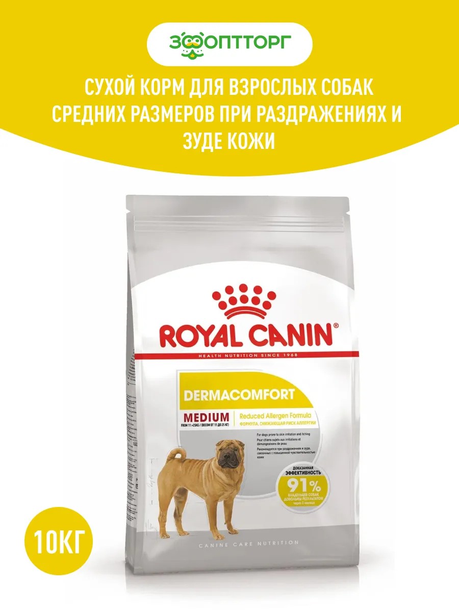 Корм для собак сухой средних размеров Royal Canin Medium Dermacomfort (весом от 11 до 25 кг) в возрасте 12 месяцев, при раздражениях и кожных покровах, связанных с повышенной чувствительностью. Собачий корм Роял Канин Медиум Дермакомфорт предназначен для собак средних размеров с чувствительной кожей в возрасте от 12 месяцев до 7 лет, специально разработан с учетом особенностей Вашей собачки в питательных веществах.