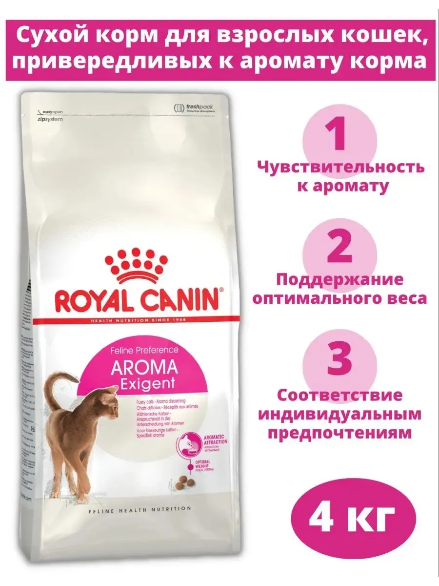 Будьте внимательны при заказе товара! Граммовка корма указана на фото и в описании! Корм Aroma Exigent Feline Preference представлен в следующих граммовках: 400 г, 2 кг, 4 кг, 10 кг. Корм сухой полнорационный сбалансированный для привередливых взрослых кошек в возрасте старше 1 года Royal Canin Aroma Exigent (роял канин арома эксиджент для кошек). Aroma Exigent: сухой корм для привередливых кошек с особо развитым обонянием. У каждой кошки есть свои естественные предпочтения при выборе корма: ароматический профиль, разнообразие текстуры и формы крокет и содержание белков. Корм для кошек royal canin aroma exigent создан специально для привередливых в питании кошек в возрасте от 1 до 7 лет, для которых особенно важен аромат продукта. Полезные свойства "royal canin exigent": - помогает поддерживать оптимальный вес, - способствует красоте шерсти, - привлекательный аромат, - 100% полнорационное и сбалансированное питание. Узнайте пищевые предпочтения вашей кошки! Наличие индивидуальных пищевых предпочтений означает, что каждая кошка по-своему интерпретирует аромат, текстуру, вкус корма и ощущения после его потребления. Сухой корм royal canin aroma exigent подходит для британцев, для персов, для сфинксов и любых других пород, для домашних котов и уличных кошек. Благодаря высокой вкусовой привлекательности Royal Canin (роял канин) представляет собой лакомство для питомца, лакомство для котов и кошек.