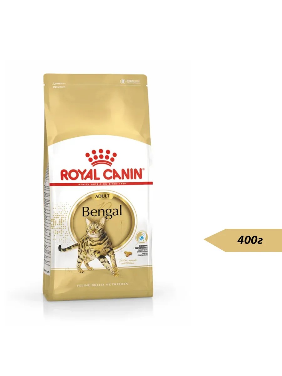 Кошки бенгальской породы отличаются чувствительной пищеварительной системой, поэтому специально разработанная для этой породы формула корма Royal Canin Bengal Adult содержит белки высокой усвояемости (LIP), фруктоолигосахариды (ФОС) и жирные кислоты, которые способствуют высокой усвояемости продукта и нормальной работе пищеварительной системы. Формула корма отличается высоким содержанием белка, что способствует сохранению атлетического сложения активных и энергичных бенгальских кошек, поддержанию мышечной массы.