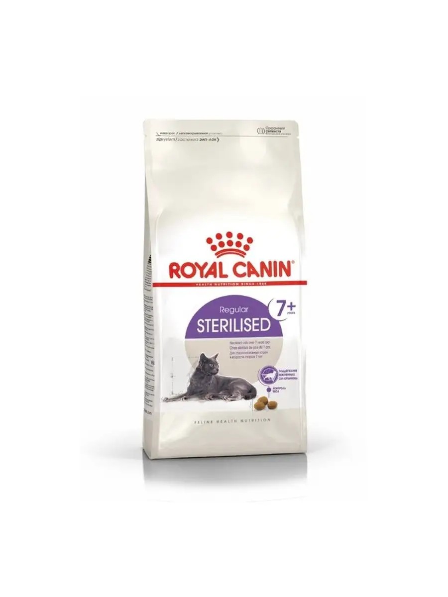Сухой полнорационный корм разработанный специально для кастрированных и стерилизованных кошек в возрасте от 7 года до 12 лет. Рацион ROYAL CANIN Sterilised 7+ учитывает особые потребности этих кошек и помогает: справитьтя с первыми признаками старения; поддерживать оптимальный вес кастрированных и стерилизованных кошек; поддерживать здоровье мочевыделительной системы; 100% полнорационное и сбалансированное питание. Полноценный и сбалансированный рацион необходим кошке в любом возрасте, однако есть питательные вещества, особенно важные для поддержания здоровья стерилизованных кошек в определенный период жизни. Рацион ROYAL CANIN Sterilised 7+ разработан специально для кастрированных и стерилизованных кошек старше 7 лет с учетом их особых потребностей в питательных веществах. Обогащен полифенолами зеленого чая, витамином C, Омега-3 кислотами ЭПК и ДГК, которые помогают поддерживать здоровье кошек на первом этапе старения.Умеренное содержание жиров ROYAL CANIN Sterilised 7+ и L-карнитин помогают снизить риск набора избыточного веса при соблюдении рекомендуемых норм кормления. ИНГРЕДИЕНТЫ: изолят растительных белков, злаки, дегидратированные белки животного происхождения, мука из зерновых культур, растительная клетчатка, животные жиры, гидролизат белков животного происхождения (вкусоароматические добавки), дрожжи и побочные продукты брожения, минеральные вещества, рыбий жир, оболочка семян подорожника, аминокислоты, соевое масло, фруктоолигосахариды, экстракт бархатцев прямостоячих (источник лютеина), глюкозамина гидрохлорид, экстракт зеленого чая (источник полифенолов), гидролизат из хряща (источник хондроитина).