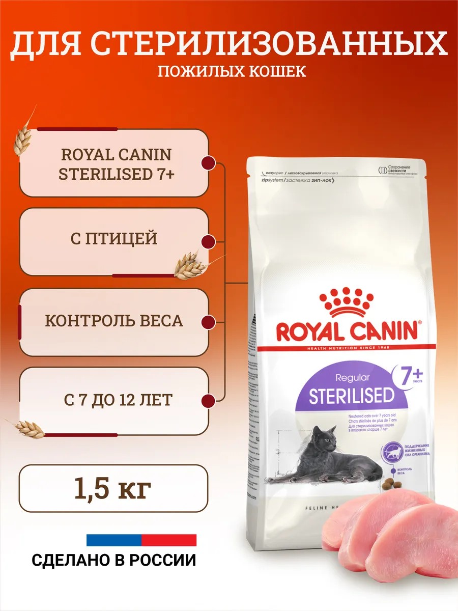 Корм для кошек Royal Canin Sterilised 7+ — это корм для кошек сухой, разработанный специально для кошек в возрасте от 7 до 12 лет. 1,5 кг