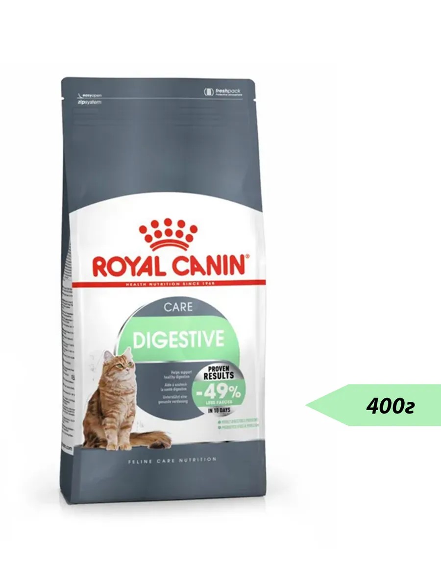 Royal Canin. Сухой полнорационный корм для взрослых кошек для поддержания здоровья пищеварительной системы, 400г. Некоторые кошки испытывают трудности с перевариванием корма, что может привести к появлению неоформленного стула. Другие кошки едят слишком быстро, что может вызывать срыгивание корма. Формула продукта Digestive care помогает оптимизировать процесс пищеварения и уменьшить количество фекалий благодаря специально подобранному комплексу нутриентов и особым характеристикам крокет.