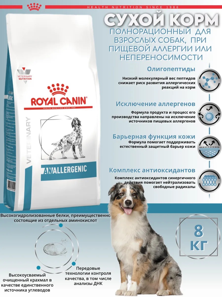 Anallergenic Корм сухой полнорационный диетический для взрослых собак, применяемый при пищевой аллергии или пищевой непереносимости. Ветеринарная диета.