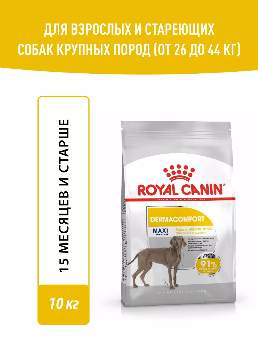 Корм сухой полнорационный для взрослых и стареющих собак крупных размеров (весом от 26 до 44 кг) в возрасте 15 месяцев и старше, при раздражениях и зуде кожи, связанных с повышенной чувствительностью MAXI DERMACOMFORT (МАКСИ ДЕРМАКОМФОРТ) ROYAL CANIN, подходящий для собак крупных размеров с чувствительной кожей в возрасте от 15-18 месяцев до 5 лет, специально разработан с учетом потребностей вашей собаки в питательных веществах.