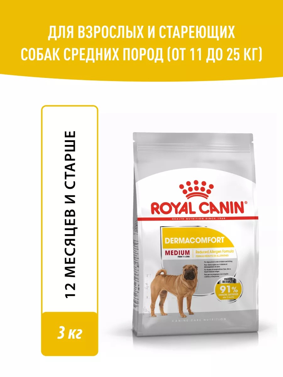 Корм сухой полнорационный для взрослых и стареющих собак средних размеров (весом от 11 до 25 кг) в возрасте 12 месяцев и старше, при раздражениях и зуде кожи, связанных с повышенной чувствительностью Medium Dermacomfort (Медиум Дермакомфорт) Royal Canin, подходящий для собак средних размеров с чувствительной кожей в возрасте от 12 месяцев до 7 лет, специально разработан с учетом потребностей вашей собаки в питательных веществах.