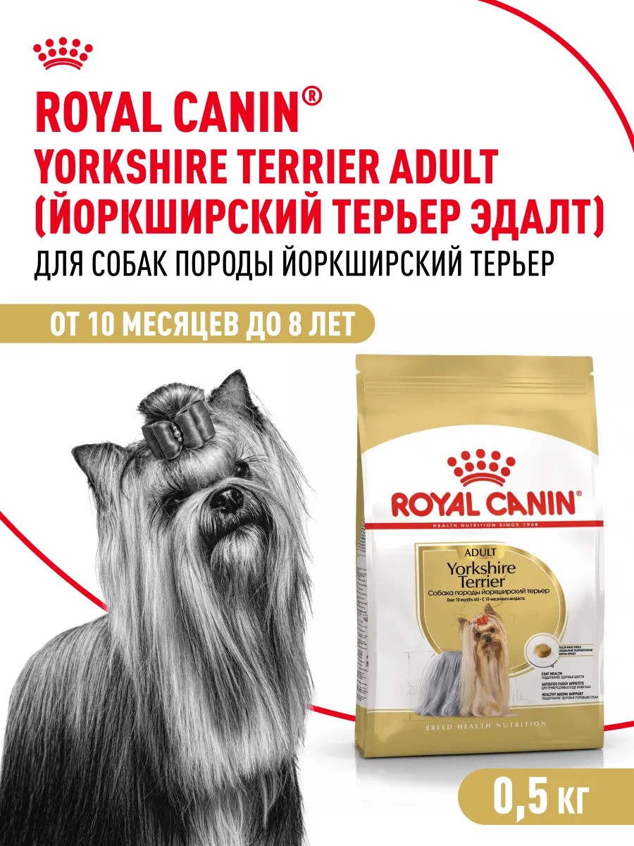 Здоровое питание для питомцев различных пород. Каждая порода собак имеет индивидуальные потребности, и гамма продуктов ROYAL CANIN ’s Breed Health Nutrition разработана для поддержания здоровья с учетом особенностей собак различных пород. Корм ROYAL CANIN Yorkshire Terrier Adult, предназначенный для собак породы йоркширский терьер старше 10 месяцев, разработан в соответствии со всеми потребностями вашей взрослой собаки в питательных веществах. Корм ROYAL CANIN Yorkshire Terrier Adult способствует поддержанию здоровья шерсти вашей собаки благодаря сбалансированному составу, обогащенному незаменимыми жирными кислотами Омега-3 (ЭПК и ДГК), Омега-6, маслом огуречника аптечного и биотином. Благодаря сочетанию привлекательного аромата и адаптированной текстуры и формы крокет ROYAL CANIN Yorkshire Terrier Adult понравится даже самым привередливым в питании собакам. Забота о гигиене ротовой полости – важный фактор, который следует учитывать при выборе корма для собаки. ROYAL CANIN Yorkshire Terrier Adult помогает замедлить образование зубного камня благодаря наличию в составе хелаторов кальция. Для удовлетворения индивидуальных предпочтений каждой собаки ROYAL CANIN Yorkshire Terrier Adult выпускается также в виде влажного корма – в форме нежного аппетитного паштета. Если вы выбрали для своей собаки смешанное питание, следуйте рекомендованным нормам кормления, чтобы сочетать сухой и влажный продукт в пропорциях, оптимальных для здоровья животного.