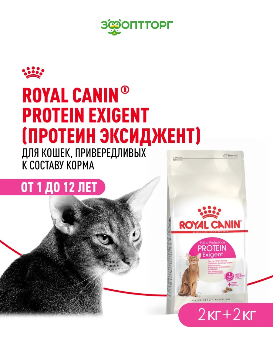 Продукт ROYAL CANIN Protein Exigent разработан специально для кошек, привередливых в питании, с учетом их особых потребностей в питательных веществах.Некоторых кошек больше привлекает питание с высоким содержанием белков. Благодаря сбалансированному соотношению белков, жиров и углеводов ROYAL CANIN Protein Exigent обладает высокой вкусовой привлекательностью для кошек с такими вкусовыми предпочтениями.Оптимальная энергетическая ценность ROYAL CANIN Protein Exigent способствует поддержанию оптимального веса животного.Кроме того, благодаря оптимальному балансу минеральных веществ рацион ROYAL CANIN Protein Exigent помогает заботиться о здоровье мочевыделительной системы вашей взрослой кошки.Преимущества:1) Предпочтение протеинам: Некоторых привередливых кошек, особо чувствительных к ощущениям после еды, привлекает высокое содержание протеинов в пище. Корм Protein Exigent, обладающий идеальной пропорцией протеинов, углеводов и жиров, специально разработан для удовлетворения естественных предпочтений этих кошек. 2) Идеальный вес: Адаптированная калорийность, способствующая поддержанию идеального веса у привередливых кошек. 3) Индивидуальные предпочтения: Каждая кошка имеет свои предпочтения при выборе пищи: ароматический профиль, вкусовое разнообразие или уровень содержания протеинов. Исходя из этого, Royal Canin разработал три рецепта, которые удовлетворят даже самых привередливых кошек. 4) Здоровая мочевыделительная система: Разработан для поддержания здоровья мочевыделительной системы у взрослых кошек.