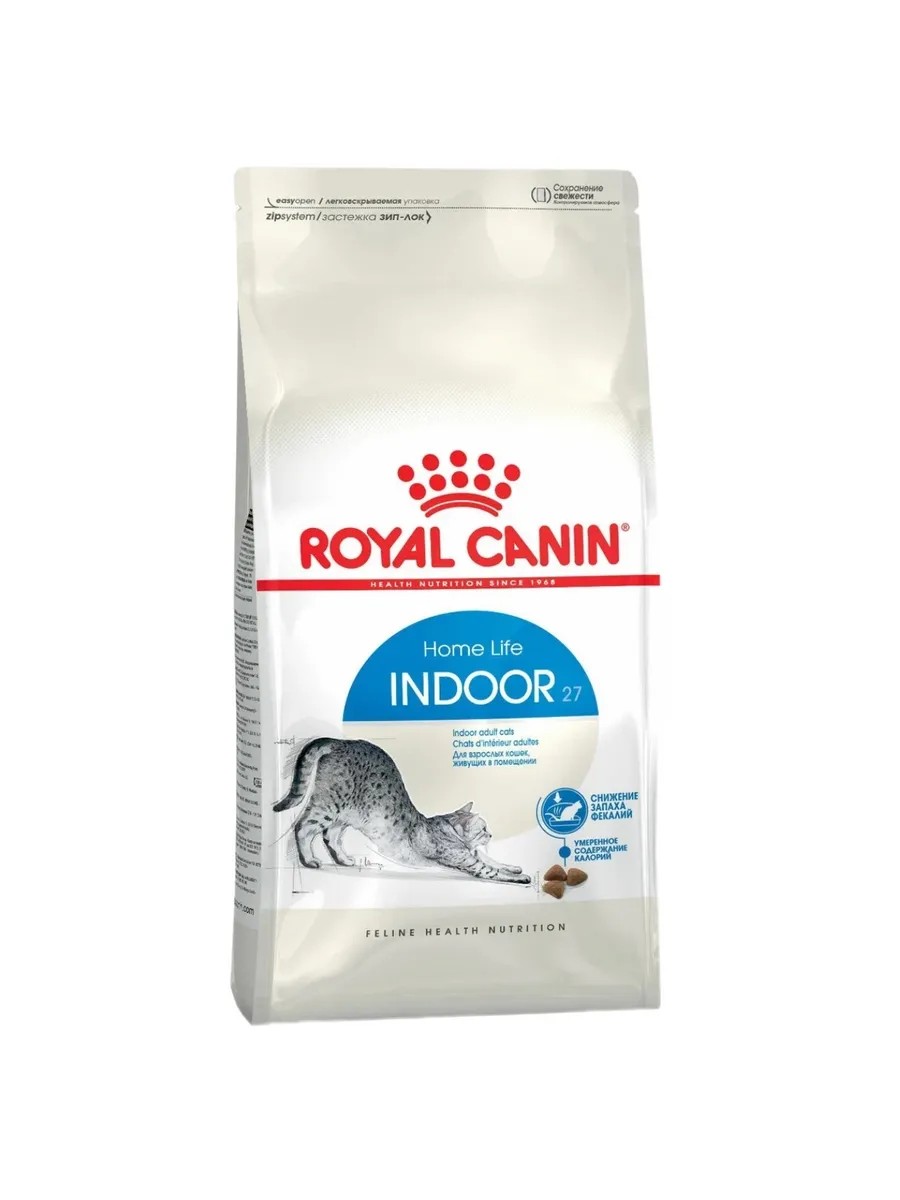 Royal Canin, dry food for indoor cats aged 1 to 7 years, 200 g. Adult cats kept indoors are less active than those with access to the outdoors. That's why a complete, balanced diet rich in valuable nutrients is so important for their health. ROYAL CANIN Indoor 27 contains highly digestible proteins (LIP), which reduce stool volume and odor (the latter is especially important for less active cats due to slow intestinal transit). The moderate fat content in the product ensures a balance between energy intake and expenditure and the maintenance of a healthy weight. Indoor cats tend to groom themselves extensively. The presence of several types of dietary fiber in the food, in particular psyllium seeds, facilitates the removal of ingested hair from the digestive tract and reduces the likelihood of hairballs.