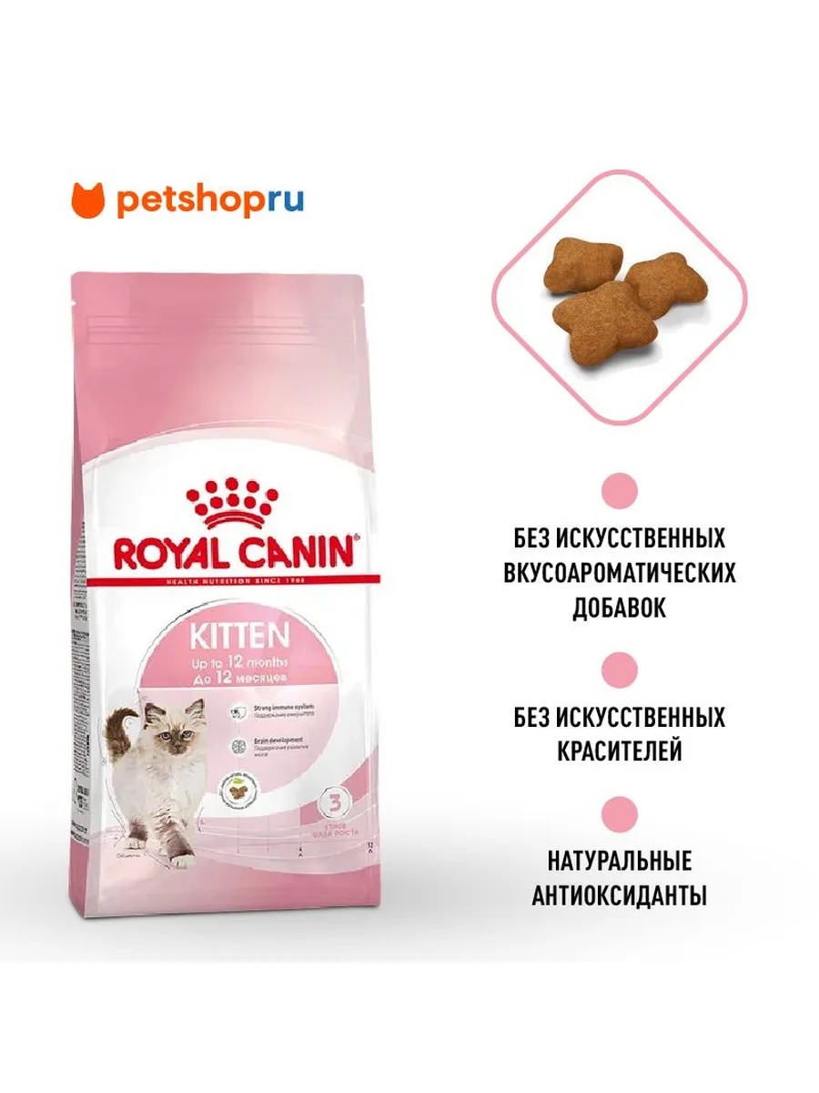 Период роста - важнейшая стадия жизни вашего котенка: это время серьезных изменений, новых открытий и испытаний. Поэтому вы должны быть уверены, что котенок получает все необходимые питательные вещества, поддерживающие его рост и гармоничное развитие. Вторая фаза роста особенно значима для котят: в это период постепенно завершается развитие иммунной системы. Корм Royal Canin Kitten поможет укрепить защитные механизмы котенка в этот период - главным образом, за счет запатентованного комплекса антиоксидантов, в который включен и чрезвычайно важный для иммунной системы витамин E. Полезные свойства: Поддержание иммунитета. Фаза роста - ключевой период в формировании иммунитета котенка. На этом этапе иммунная система котенка развивается постепенно. Корм Kitten способствует формированию естественных механизмов защиты котенка благодаря комплексу антиоксидантов, в том числе витамина Е. Здоровая пищеварительная система. Повышенная усвояемость корма благодаря высокоусвояемым белкам (L.I.P.) и пребиотикам (в том числе фруктоолигосахаридам). Здоровый рост. Адаптированное содержание протеинов, витаминов и минералов, в том числе витамина D и кальция. Высокая калорийность, отвечающая потребностям животного в период интенсивного роста. L.I.P. технология высокой усвояемости. Специально отобранные белки с коэффициентом усвояемости выше 90 % (Royal Canin).