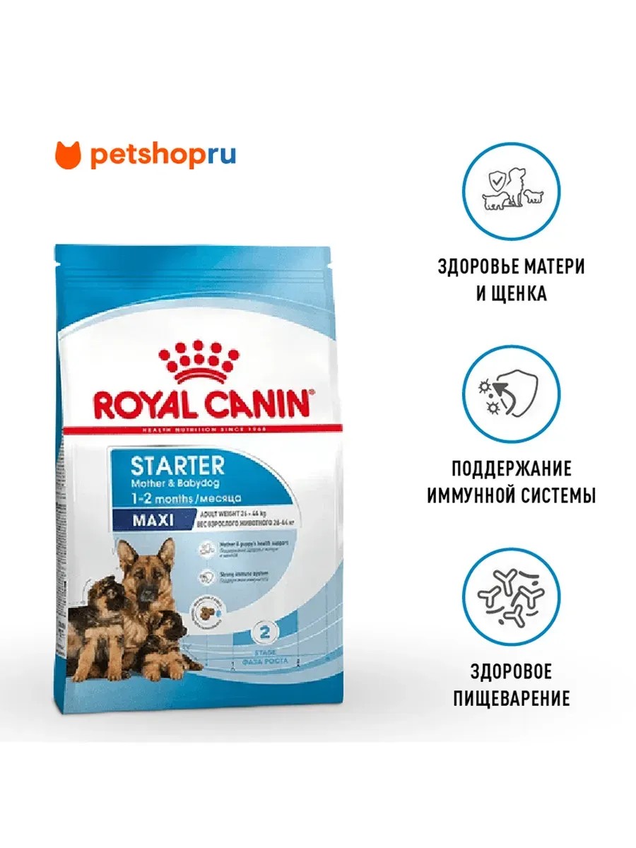 ROYAL CANIN Maxi Starter Mother&Babydog удовлетворяет энергетические потребности взрослых крупных собак в период беременности и лактации, а также их щенков.