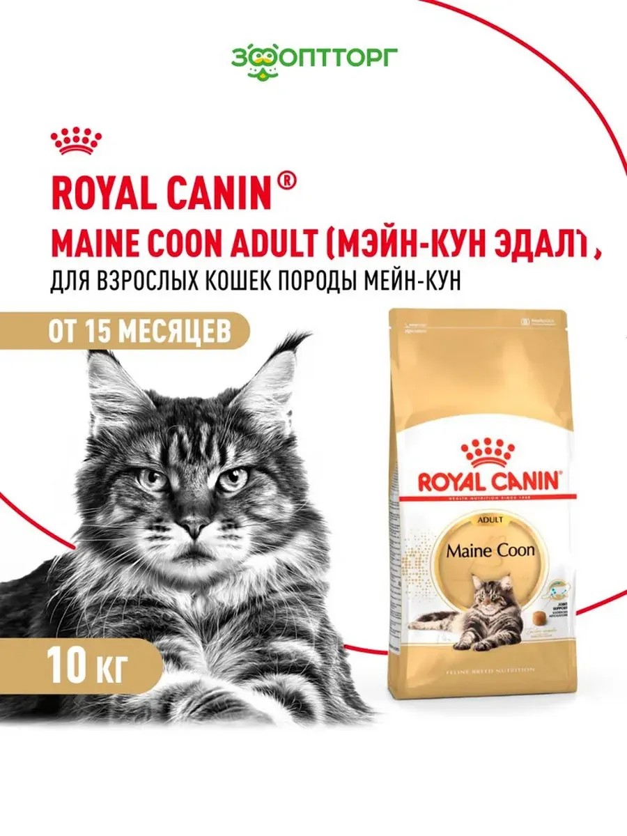 Корм сухой полнорационный сбалансированный для кошек - Специально для взрослых кошек породы Мэйн Кун старше 15 месяцев MAINE COON ADULT (МЕЙН КУН ЭДАЛТ) ROYAL CANIN, подходящий для кошек породы мейн-кун в возрасте от 15 месяцев и старше, специально разработан с учетом потребностей вашей кошки в питательных веществах.