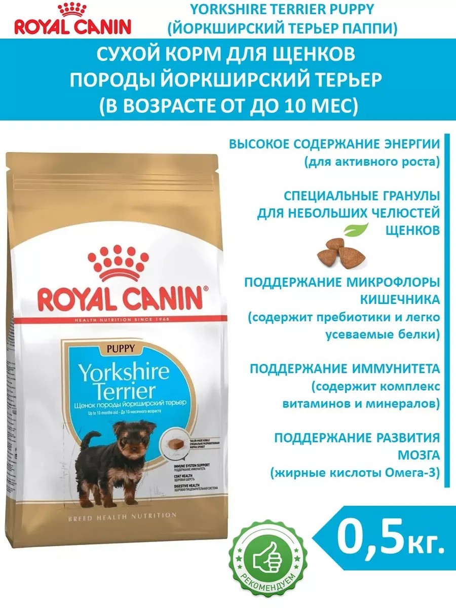 | Комплектация | для щенков; сухой корм 0,5 кг; 1 шт Роял канин Йоркширский терьер паппи |
