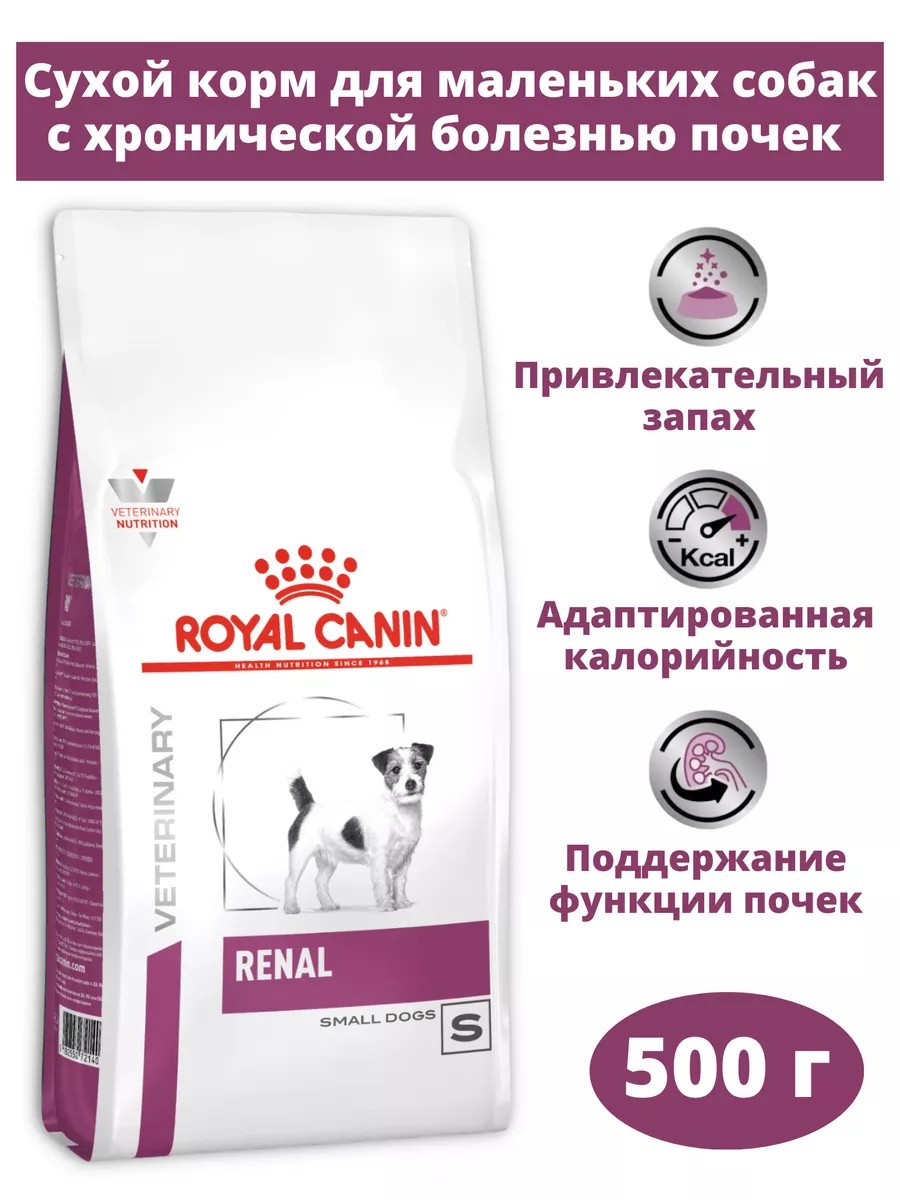 беременность, лактация, рост. РЕКОМЕНДАЦИИ: посоветуйтесь с вашим ветеринарным врачом по поводу целесообразности использования данного корма. Развитие почечной недостаточности у собаки происходитбез видимых симптомов. Потеря аппетита у питомца - частая пробема при данном заболевании. Лечебный корм Royal Canin Renal Small Dog обладает специальным ароматическим профилем, а также особой формой кроекты, удобной для захвата собаками некрупных пород, которые помогают стимулировать сниженный аппетит и удовлетворяютизбирательный вкус животного. При этом корм содержит пониженное количество фосфора и умеренное количество высококачественногобелка для поддержания функции почек. Преимущества: 1) Поддержание функции почек: пониженное содержание фосфора и умеренное количество высококачественного белка для поддержания функции почек. 2) Адаптированное содержание энергии: